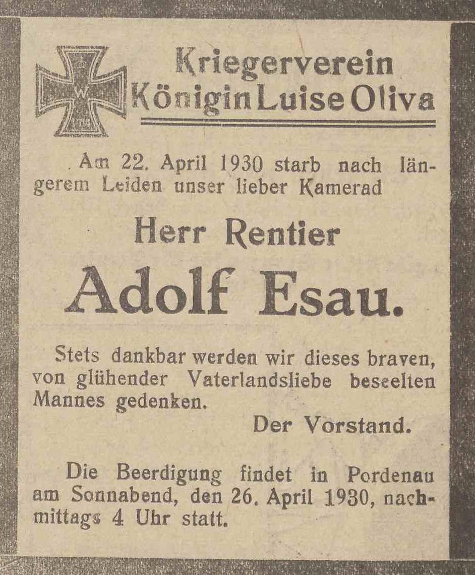 Adolf Esau. Erch Esau. Robert Esau. Hermann, Anna Furrer zd. Esau. Rudolf, Else Brambach zd. Esau. Emil Esau. Pochowany w Pordenowie (pomorskie). Olivaer Zeintung nr 94 z 23. 04. 1930 r.