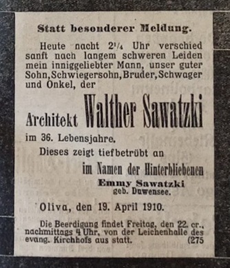 Walter Sawatzki (zm. 19. 04. 1910 w wieku 36 lat). Emmy Sawatzki zd. Duwansee. Olivaer Nachrichten nr 33 z 1910 r.
