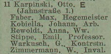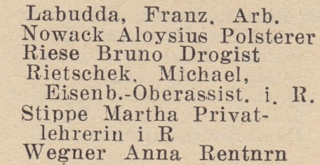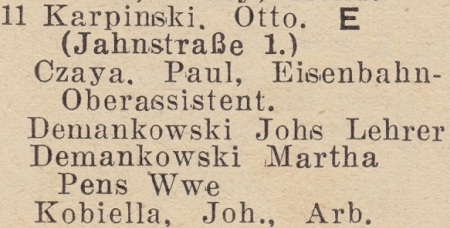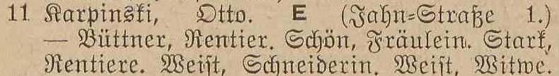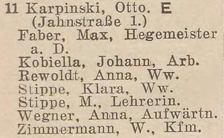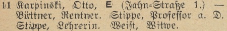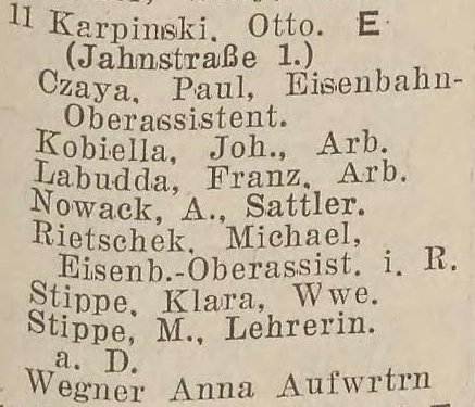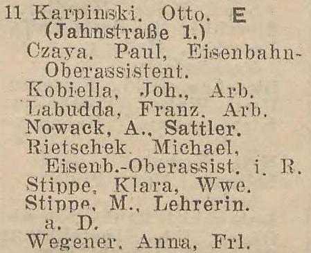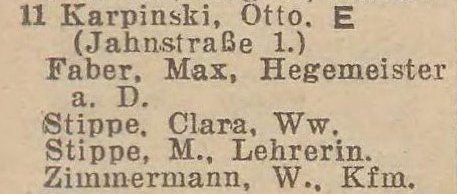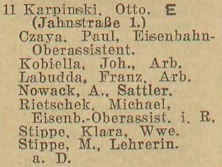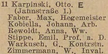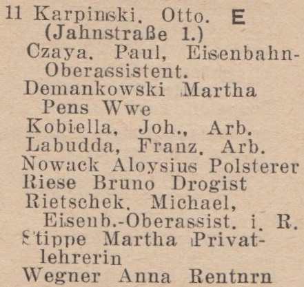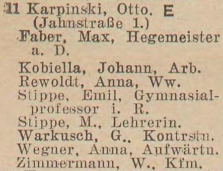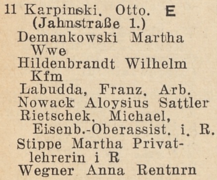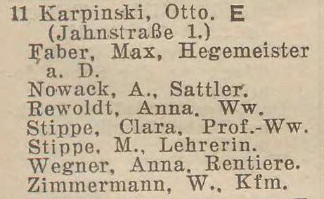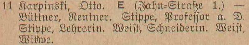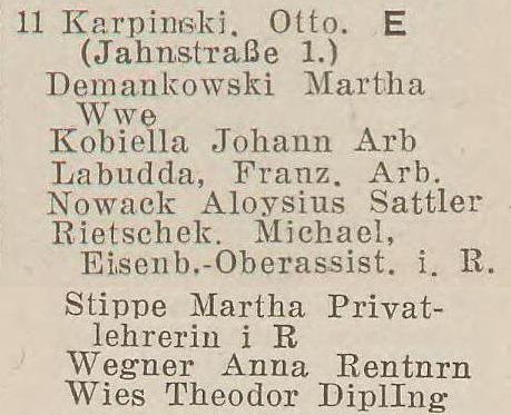 Otto Karpinski - Hausbesitzer: Jahnstraße (Liczmańskiego) nr 1-2, 5, 8 i 17, Olivaer Rosengasse (Kwietna) nr 1, 33/35, Am Wächterberg (Podhalańska) nr 11 oraz Waldstraße (Leśna) nr 8.