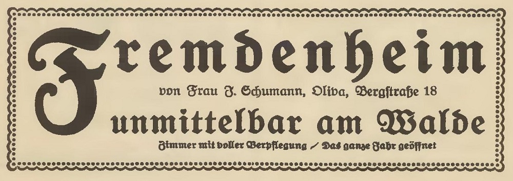 Fremdenheim. Julie Schumann (Pensioninhaberin - 1916). Luftkurort und Ostseebad Oliva bei Danzig, 1914.