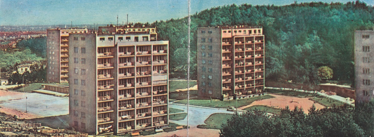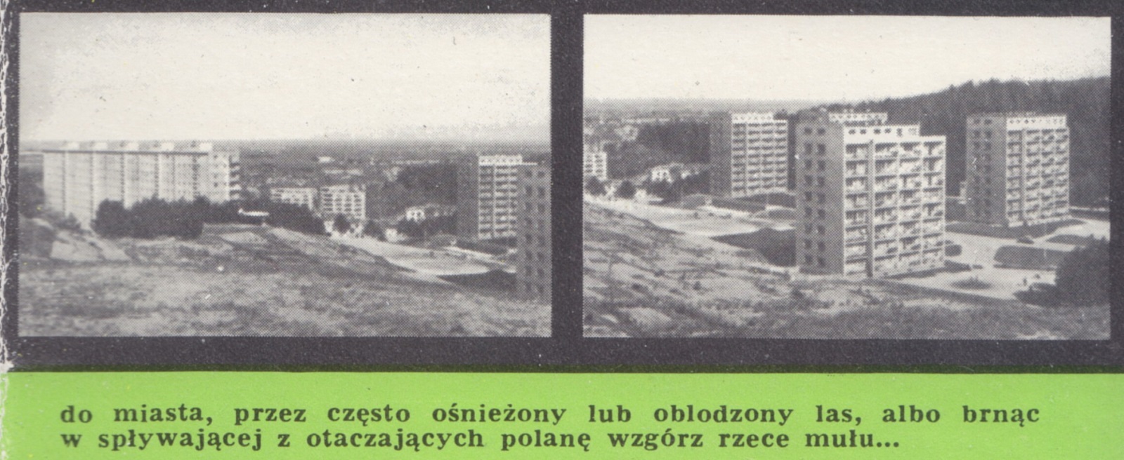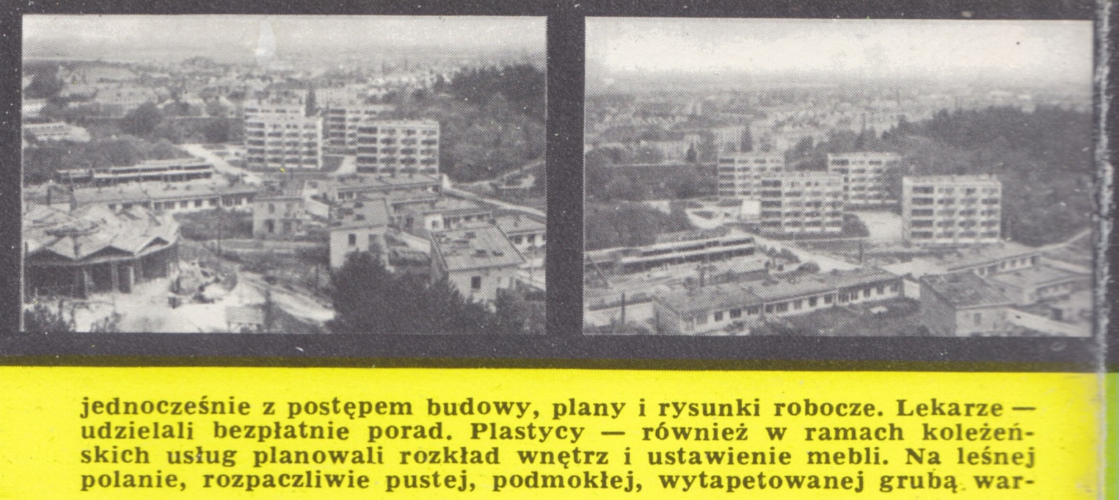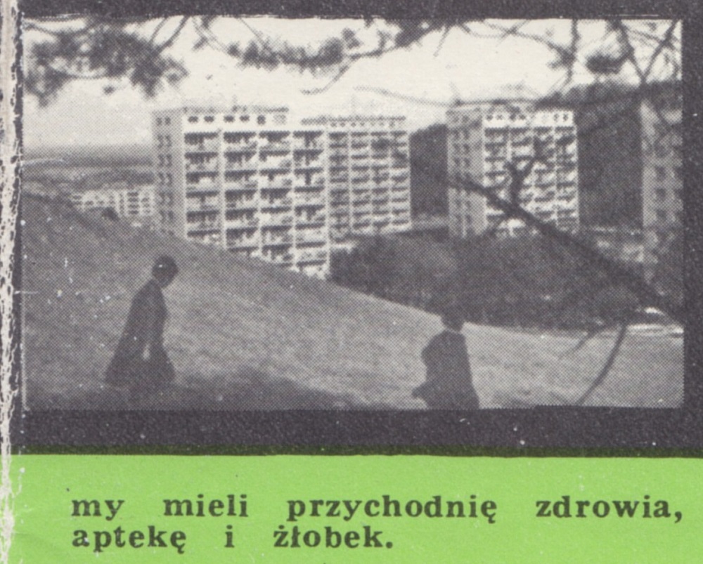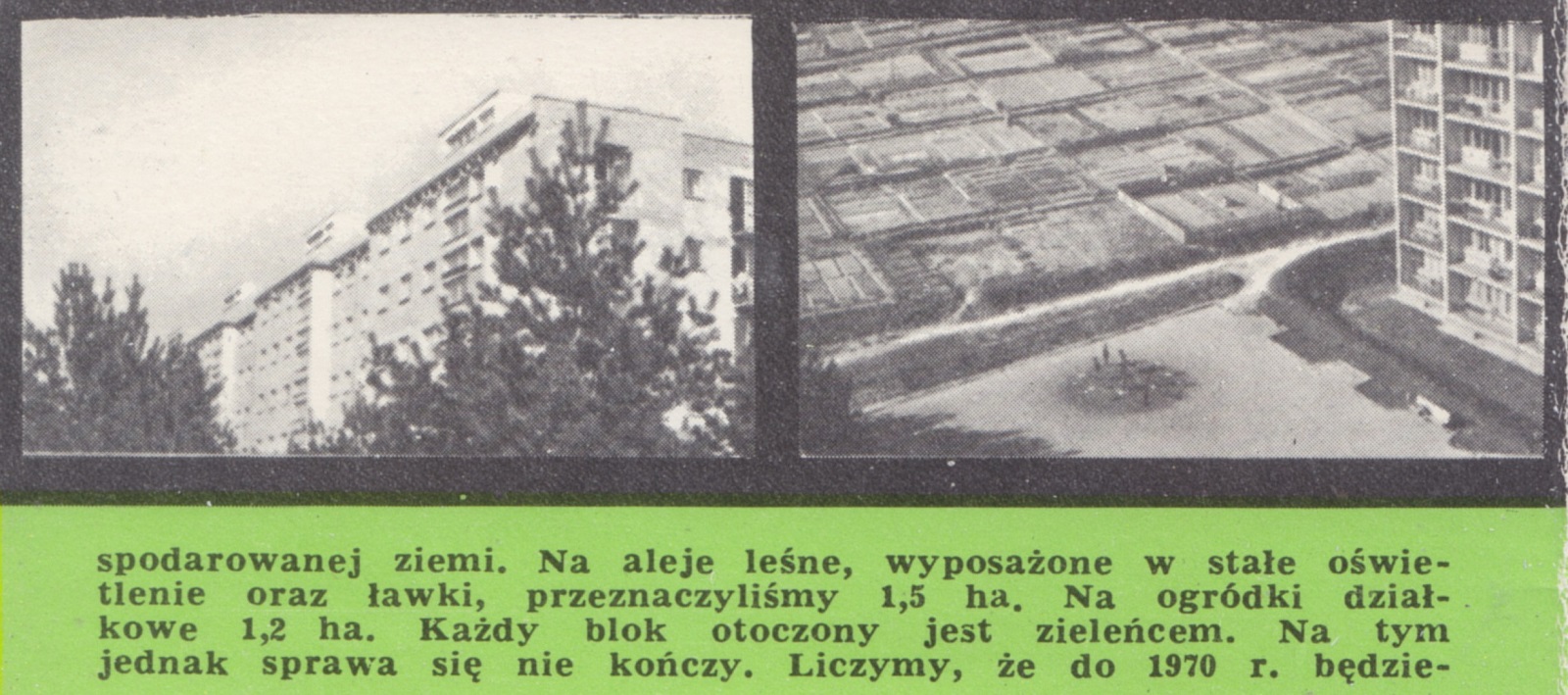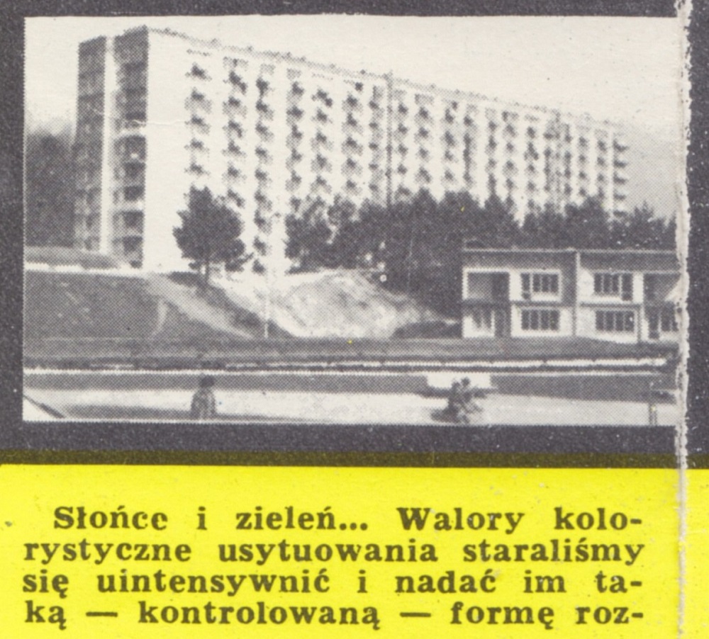 Słońce i zieleń... Walory kolorystyczne usytuowania staraliśmy się uintensywniać i nadać im taką - kontrolowaną - formę rozwoju aby zyskały na tym nie tylko względy estetyczne, lecz również zdrowotne i wypoczynkowe mieszkańców osiedla. Nie wycinaliśmy drzew, ale dokonaliśmy przesadzeń. Skwery, skarpy, klomby i naturalne altanki zajmują w sumie 5 ha zagospodarowanej ziemi. Na aleje leśne, wyposażone w stałe oświetlenie oraz ławki, przeznaczyliśmy 1,2 ha. Każdy blok otoczony jest zieleńcem. Na tym sprawa się nie kończy. Liczymy że do 1970 r. będziemy mieli przychodnię zdrowia, aptekę i żłobek.