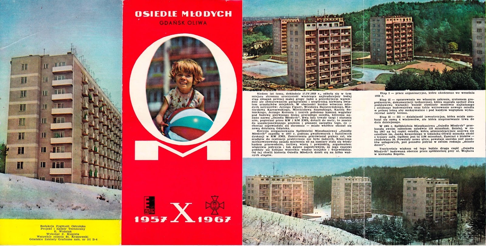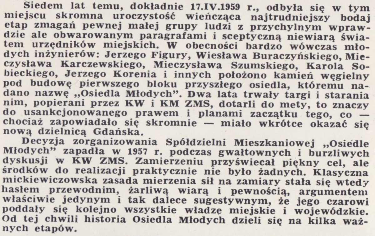 Siedem lat temu, dokładnie 17.IV.1959 r., odbyła sie w tym miejscu skromna uroczystość wieńcząca najtrudniejszy bodaj zmagań pewnej małej grupy ludzi z przychylnym wprawdzie ale obwarowanym paragrafami i sceptyczną niewiarą światem urzędników miejskich. W obecności wówczas bardzo młodych inżynierów: Jerzego Figury, Wiesława Buraczyńskiego, Mieczysława Kraczewskiego, Jerzego Korenia i innych położono kamień węgielny pod budowę pierwszego bloku przyszłego osiedla, któremu nadano nazwę "Osiedle Młodych". Dwa lata trwały targi i starania nim, popierani przez KW [Komitet Wojewódzki] i KM ZMS [Komitet Miejski Związku Młodzieży Socjalistycznej], dotarli do met, to znaczy do usankcjonowanego prawem i planami zaczątku tego, co - chociaż zapowiadało się skromnie - miało wkrótce okazać się nową dzielnicą Gdańska.