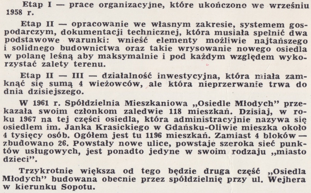 W 1961 r. Spółdzielnia Mieszkaniowa "Osiedle Młodych" przekazała swoim członkom zaledwie 118 mieszkań. Dzisiaj, w roku 1967 na tej części osiedla, która administracyjnie nazywa się osiedlem im. Janka Krasickiego w Gdańsku-Oliwie mieszka około 4 tysięcy osób. Ogółem jest tu 1196 mieszkań. Zamiast 4 bloków - zbudowano 26. Powstały nowe ulice, powstaje szeroka sieć punktów usługowych, jest ponadto jedyne w swoim rodzaju "miasteczko dzieci".