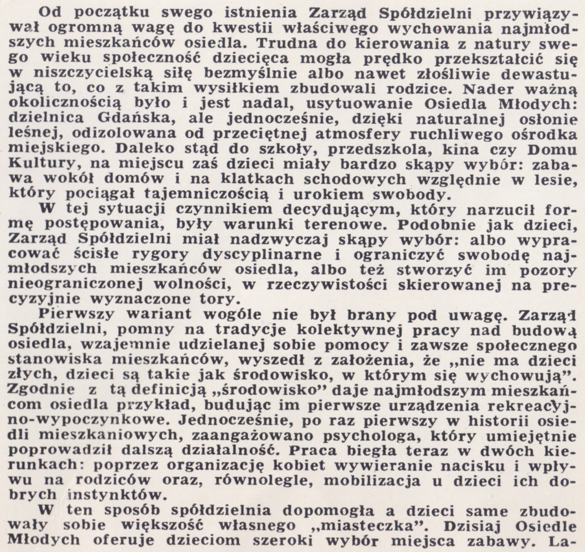 Od początku swego istnienia Zarząd Spółdzielni przywiązywał ogromną wagę do kwestii wychowania najmłodszych mieszkańców osiedla. Trudna do kierowania z natury swego wieku społeczność dziecięca mogła prędko przekształcić się w niszczycielską siłę bezmyślnie albo nawet złośliwie dewastującą to, co takim wysiłkiem zbudowali rodzice. Nader ważną okolicznością było i jest nadal, usytuowanie Osiedla Młodych: dzielnica Gdańska, ale jednocześnie, dzięki naturalnej osłonie leśnej, odizolowana od przeciętnej atmosfery ruchliwego ośrodka miejskiego. Daleko stąd do szkoły, przedszkola, kina czy Domu Kultury, na miejscu zaś dzieci miały bardzo skąpy wybór: zabawa wokół domów i na klatkach schodowych względnie w lesie, który pociągał tajemniczością i urokiem swobody.