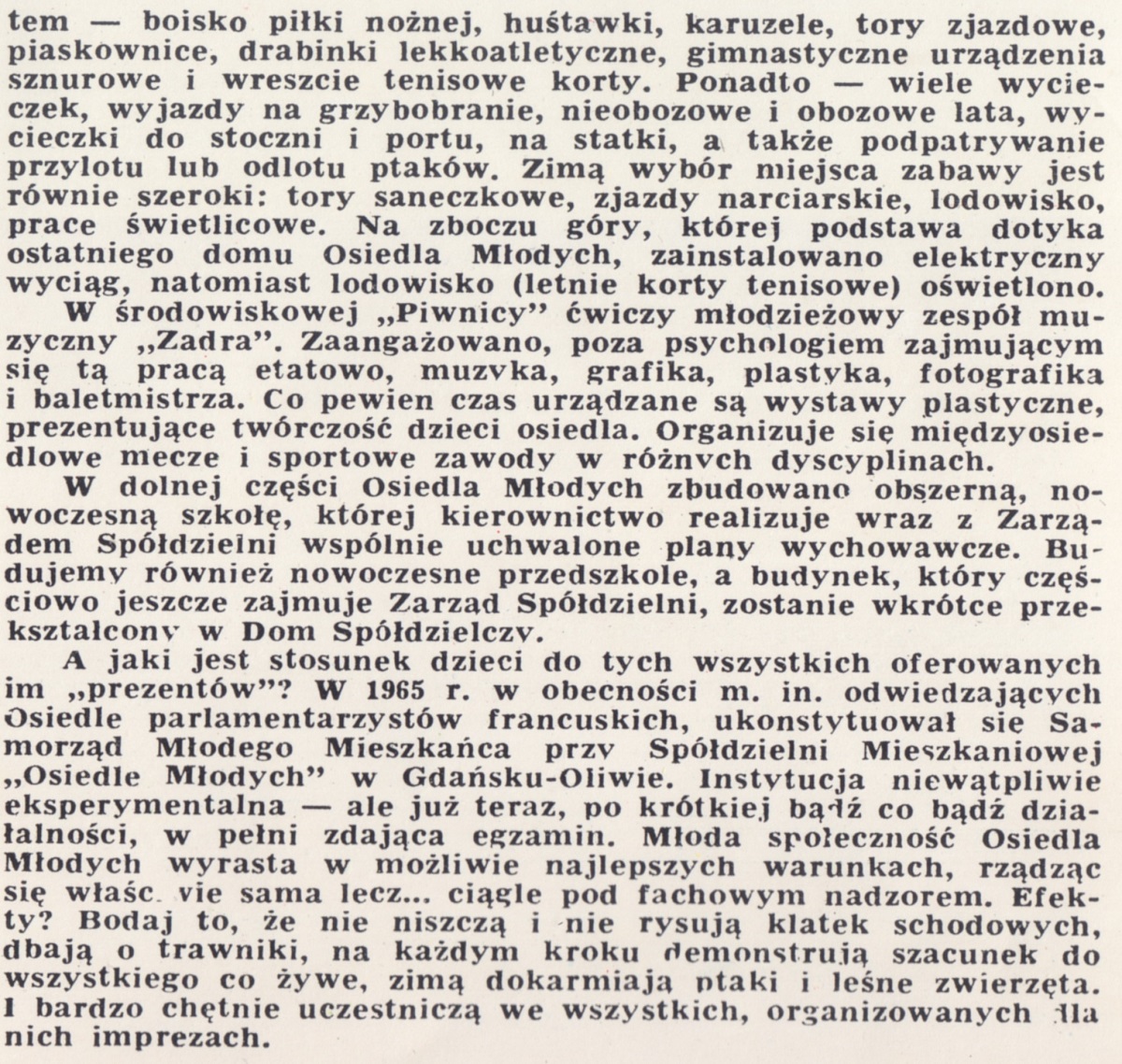 A jaki jest stosunek dzieci do tych wszystkich oferowanych im "prezentów"? W 1965 r. w obecności m. in. odwiedzających Osiedle parlamentarzystów francuskich, ukonstytuował się Samorząd Młodego Mieszkańca przy Spółdzielni Mieszkaniowej "Osiedle Młodych" w Gdańsku-Oliwie. Instytucja niewątpliwie eksperymentalna - ale już teraz, po krótkiej bądź co bądź działalności, w pełni zdająca egzamin. Młoda społeczność Osiedla Młodych wyrasta w możliwie najlepszych warunkach, rządząc się właściwie sama lecz... ciągle pod fachowym nadzorem. Efekty? Bodaj to, że nie niszczą i nie rysują klatek schodowych, dbają o trawniki, na każdym kroku demonstrują szacunek do wszystkiego co żywe, zimą dokarmiają ptaki i leśne zwierzęta. I bardzo chętnie uczestniczą we wszystkich, organizowanych dla nich imprezach.
