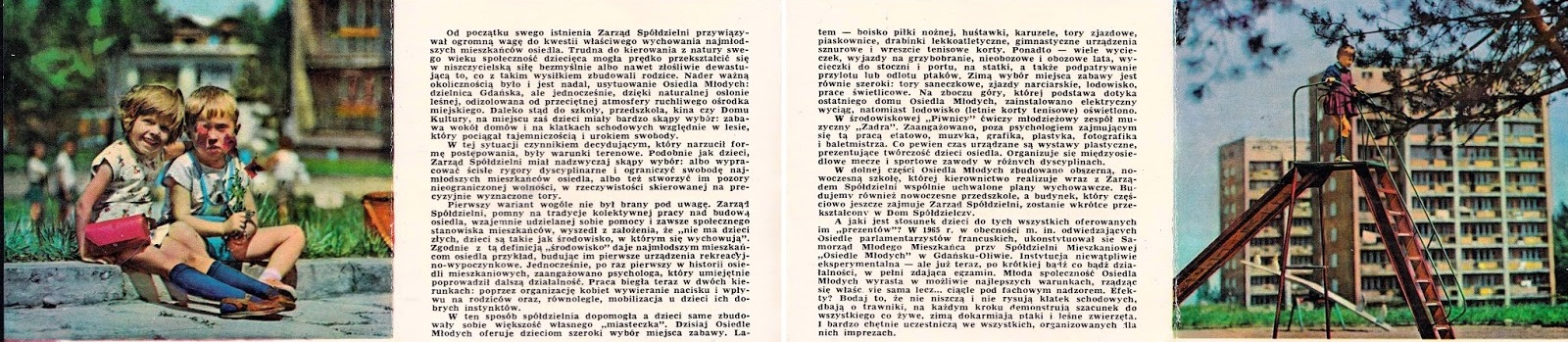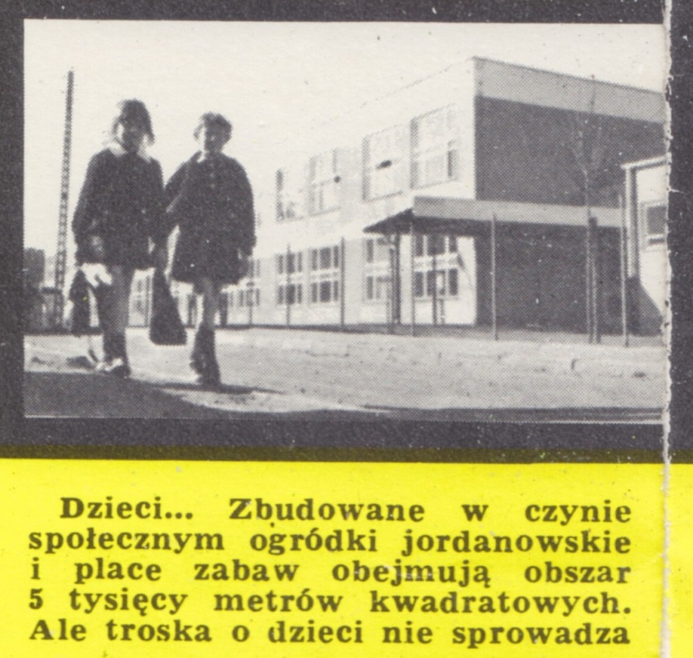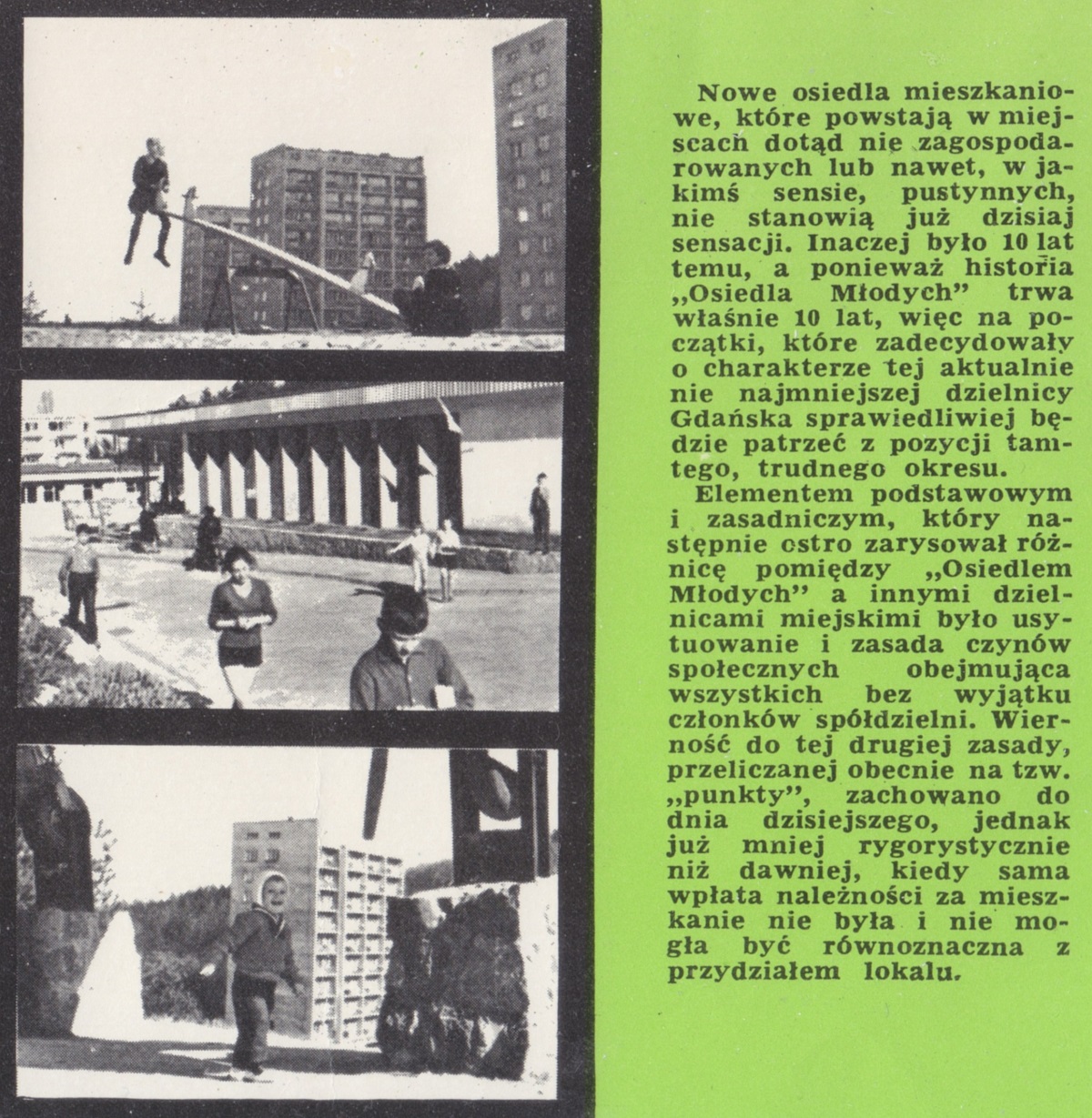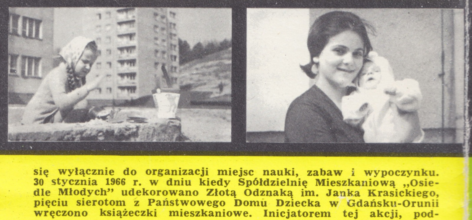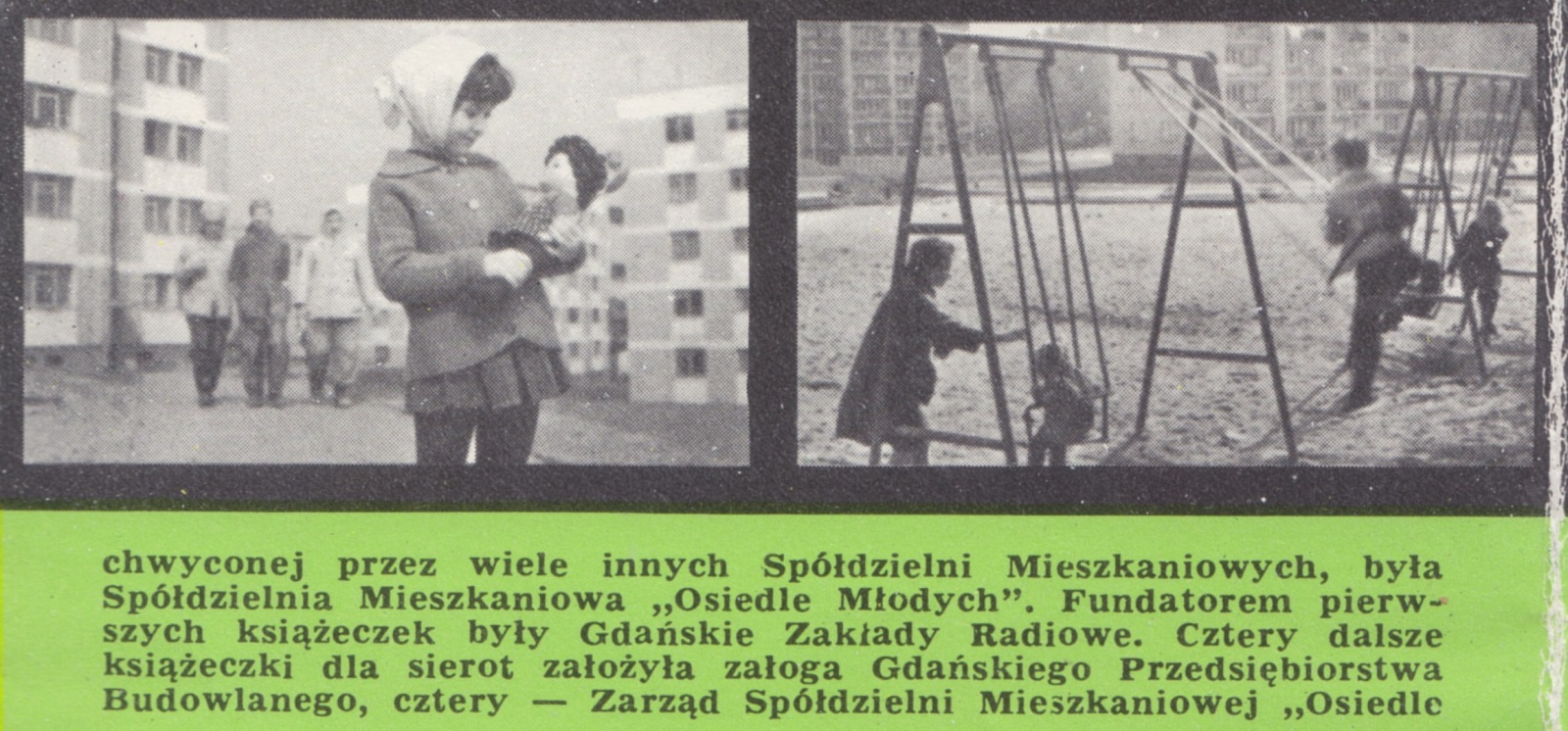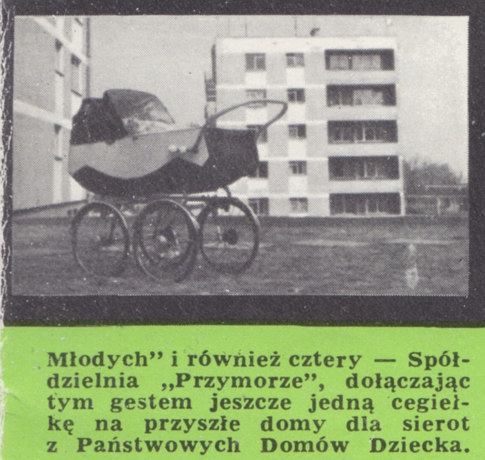 Dzieci... Zbudowane w czynie społecznym ogródki jordanowskie i place zabaw obejmują obszar 5 tysięcy metrów kwadratowych. Ale troska o dzieci nie sprowadza się wyłącznie do organizacji miejsc nauki, zabaw i wypoczynku. 30 stycznia 1966 r. w dniu kiedy Spółdzielnię Mieszkaniową "Osiedle Młodych" udekorowano złotą odznaką im. Janka Krasickiego, pięciu sierotom z Państwowego Domu Dziecka w Gdańsku-Orunii wręczono książeczki mieszkaniowe. Inicjatorem tej akcji, podchwyconej przez wiele innych Spółdzielni Mieszkaniowych, była Spółdzielnia Mieszkaniowa "Osiedle Młodych". Fundatorem pierwszych książeczek były Gdańskie Zakłady Radiowe. Cztery dalsze książeczki dla sierot założyła załoga Gdańskiego Przedsiębiorstwa Budowlanego, cztery - Zarząd Spółdzielni Mieszkaniowej "Osiedle Młodych" i również cztery - Spółdzielnia "Przymorze", dołączając tym gestem jeszcze jedną cegiełkę na przyszłe domy dla sierot z Państwowych Domów Dziecka.