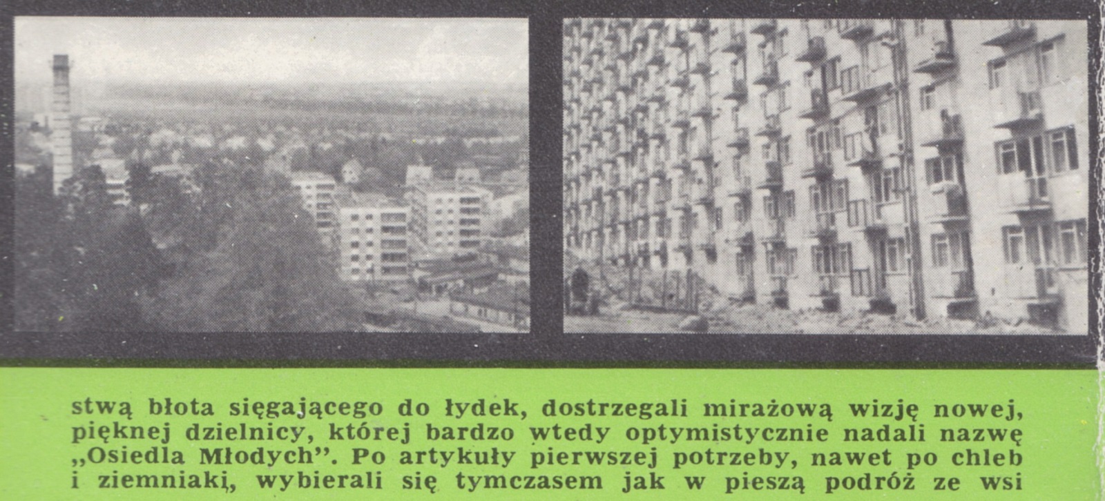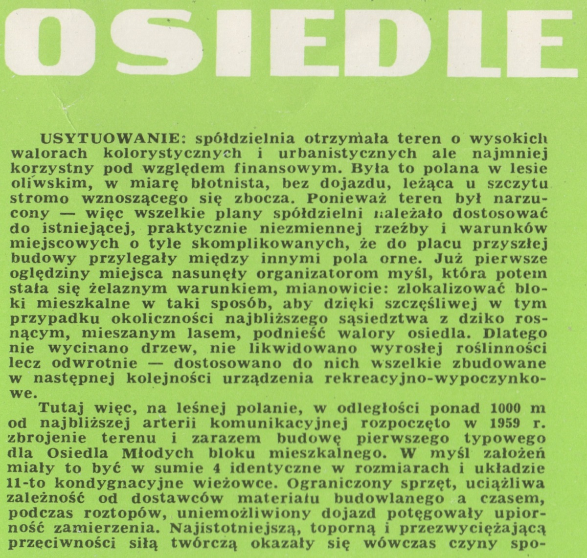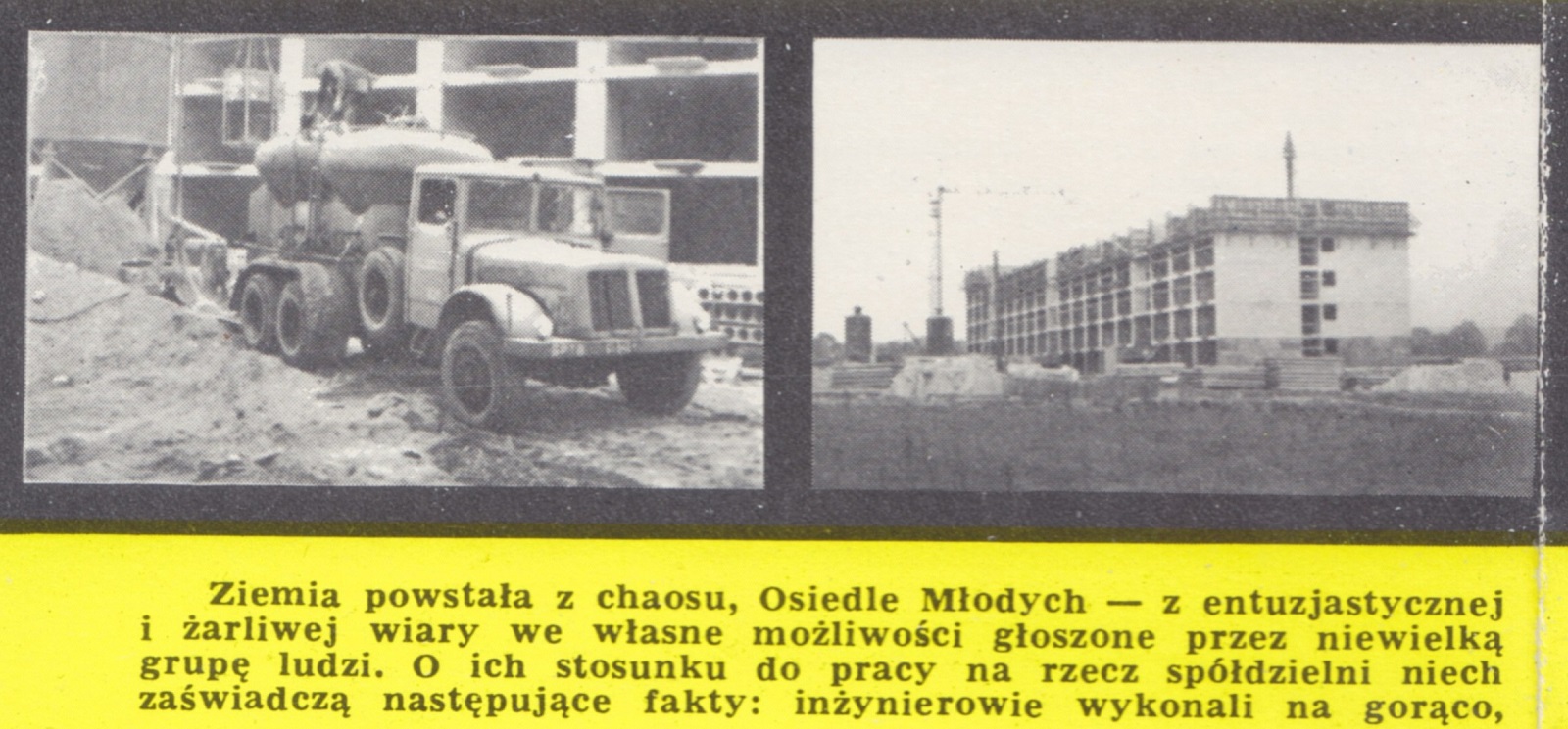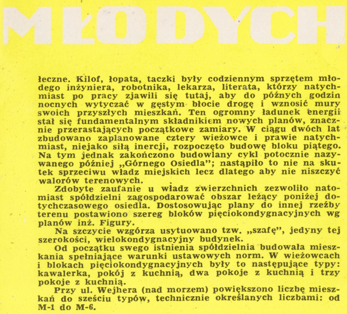 Ziemia powstała z chaosu, Osiedle Młodych - z entuzjastycznej i żarliwej wiary własne możliwości głoszone przez niewielką grupę ludzi. O ich stosunku do pracy na rzecz spółdzielni niech zaświadczą następujące fakty: inżynierowie wykonali na gorąco, jednocześnie z postępem budowy, plany i rysunki robocze. Lekarze - udzielili bezpłatnych porad. Plastycy - również koleżeńskich usług planowali rozkład wnętrz i usytuowanie mebli. Na leśnej polanie, rozpaczliwie pustej, podmokłej, wytapetowanej grubą, warstwą błota sięgającego do łydek, dostrzegli mirażową wizję nowej, pięknej dzielnicy, której bardzo wtedy optymistycznie nadali nazwę "Osiedla Młodych". Po artykuły pierwszej potrzeby, nawet po chleb i ziemniaki, wybierali się tymczasem jak w pierwszą podróż ze wsi do miasta, przez często ośnieżony lub oblodzony las, albo brnąc w spływającej z otaczających polanę wzgórz rzece mułu...
