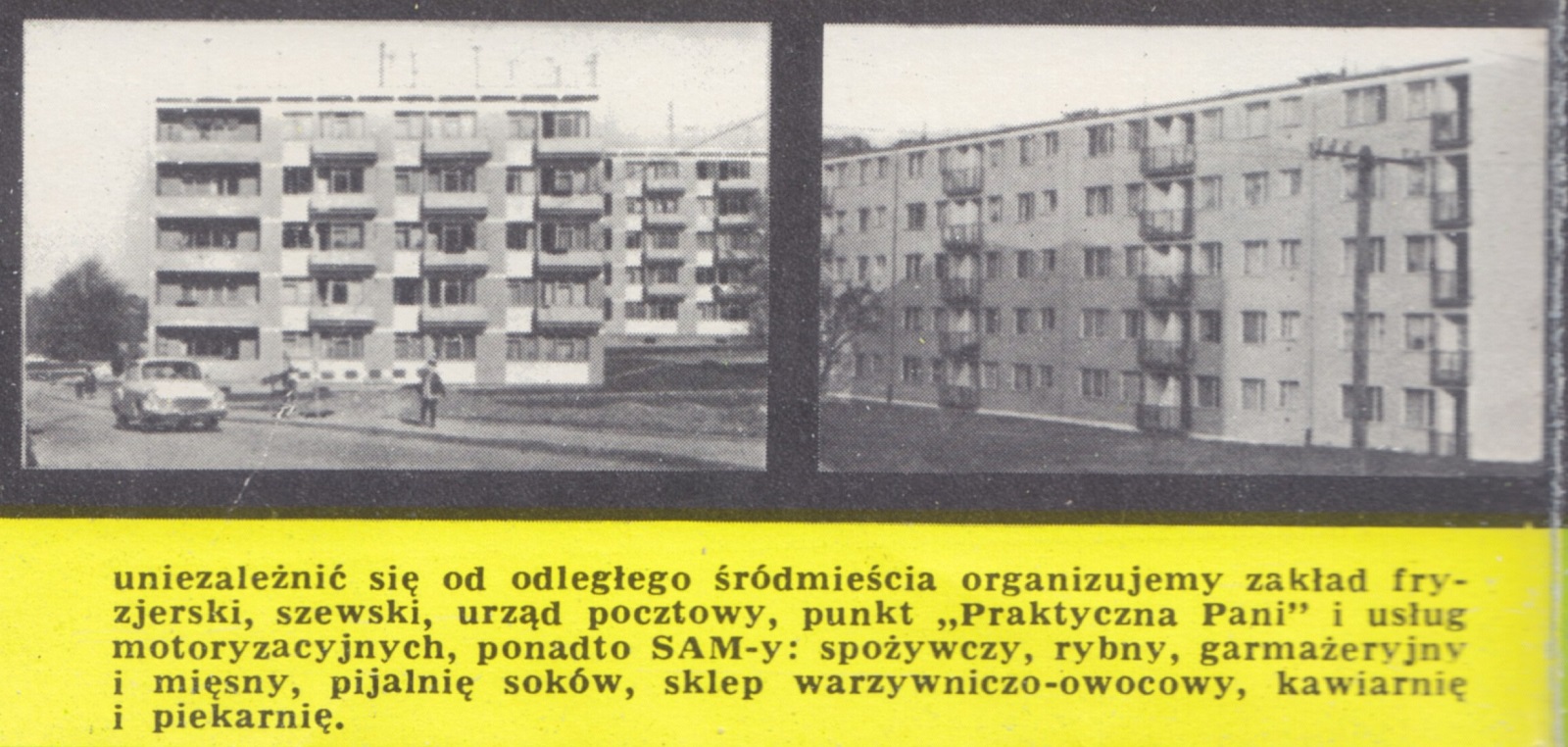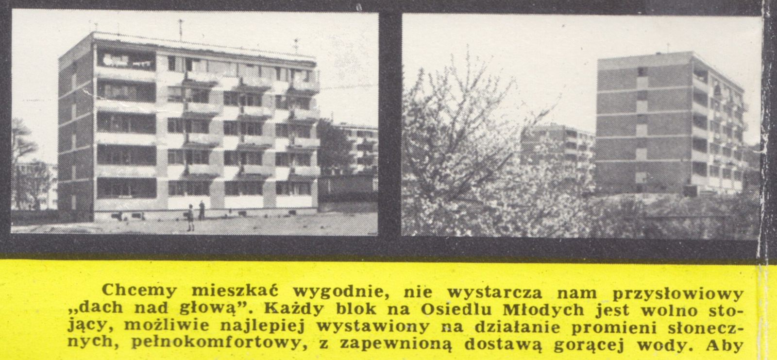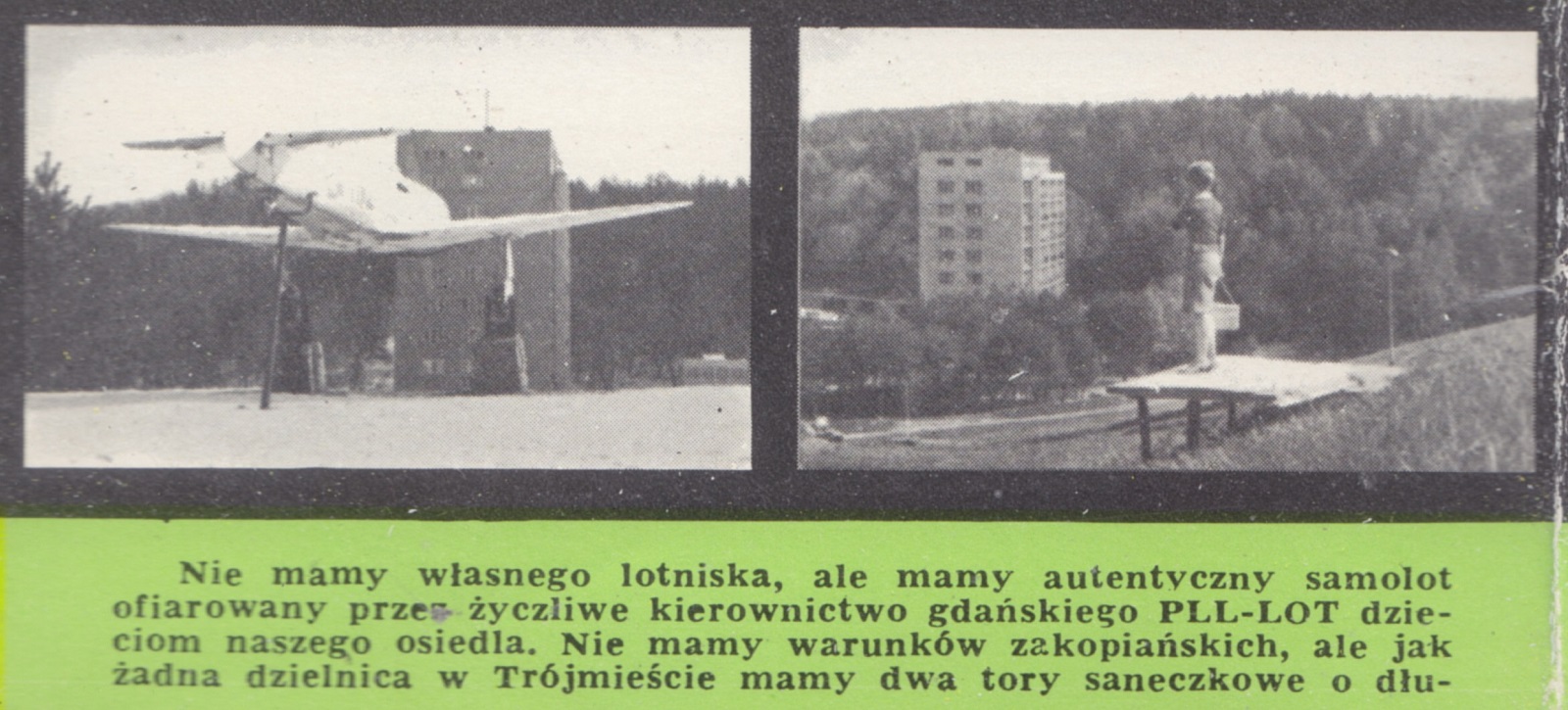 Chcemy mieszkać wygodnie, nie wystarcza nam przysłowiowy "dach nad głową". Każdy blok na Osiedlu Młodych jest wolno stojący, możliwie najlepiej wystawiony na działanie promieni słonecznych, pełnokomfortowy, z zapewnioną dostawą gorącej wody. Aby uniezależnić się od odległego śródmieścia organizujemy zakład fryzjerski, szewski, urząd pocztowy, punkt "Praktyczna Pani" i usług motoryzacyjnych, ponadto SAM-y: spożywczy, rybny, garmażeryjny i mięsny, pijalnię soków, sklep warzywniczo-owocowy, kawiarnię i piekarnię. Nie mamy własnego lotniska, ale mamy autentyczny samolot ofiarowany przez życzliwe kierownictwo gdańskiego PLL-LOT dzieciom naszego osiedla. Nie mamy warunków zakopiańskich, ale jak żadna dzielnica w Trójmieście mamy dwa tory saneczkowe o długości 350 i 600 m; mamy również skocznię narciarską o długości skoków do 40 m oraz duże korty tenisowe zimą przekształcane w lodowisko nie tylko dla najmłodszych…