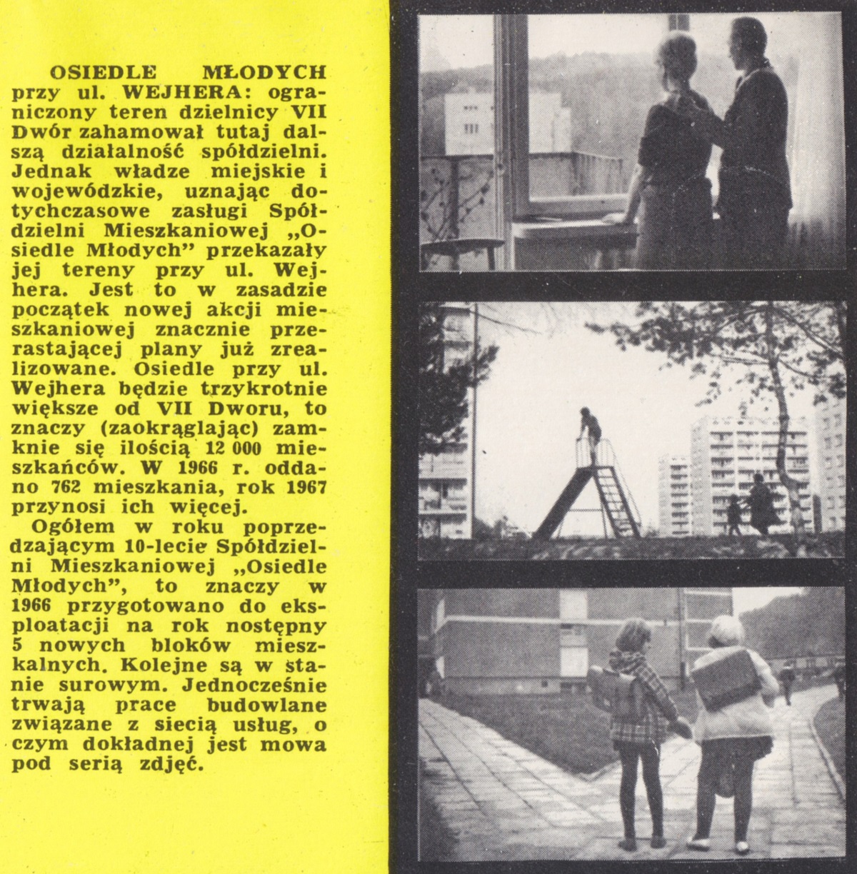 OSIEDLE MŁODYCH przy ul. WEJHERA: ograniczony teren dzielnicy VII Dwór zahamował tutaj dalszą działalność spółdzielni. Jednak władze miejskie i wojewódzkie, uznając dotychczasowe zasługi Spółdzielni Mieszkaniowej „Osiedle Młodych” przekazały jej tereny przy ul. Wejhera. Jest to w zasadzie początek nowej akcji mieszkaniowej znacznie przerastającej plany już zrealizowane. Osiedle przy ul. Wejhera będzie trzykrotnie większe od VII Dworu, to znaczy (zaokrąglając) zamknie się liczbą 12 000 mieszkańców. W 1966 r. Oddano 762 mieszkania, rok 1967 przynosi ich więcej.