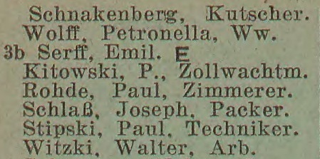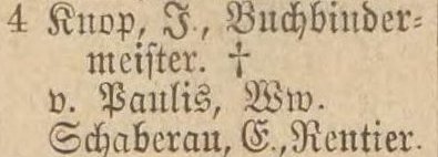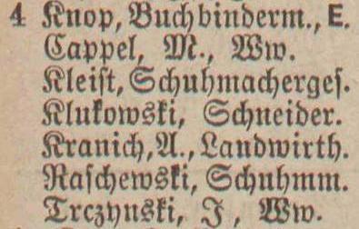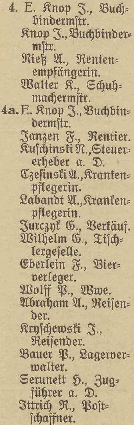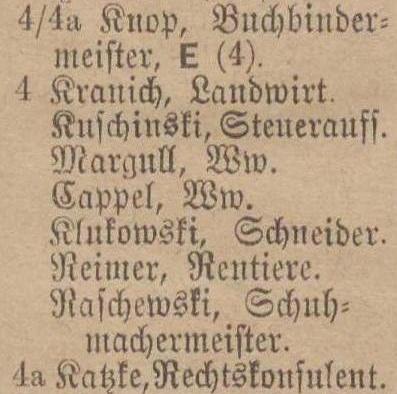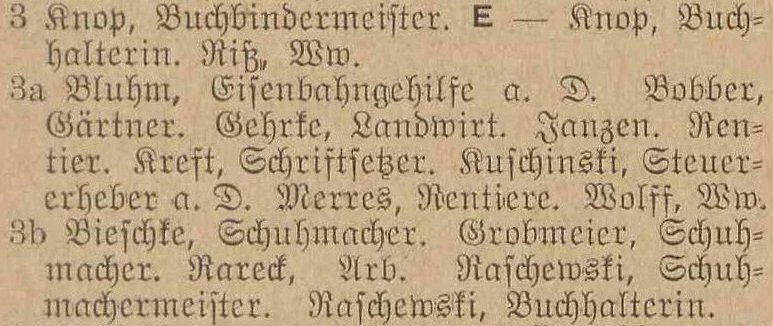 Hildebrandt, Paul, Versich. Inspekt. Knop, Johannes, Buchbindermstr. Priem, Adolf, figl. Förster a. D. v. Paulitz, Ferdinande, geb. v. Münchow, Frail.