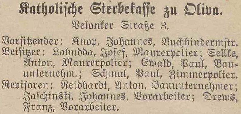 Katholische Sterbekasse zu Oliva. Książka adresowa gminy Oliwa z 1913 r. Zbiory Pomorskiej Biblioteki Cyfrowej.