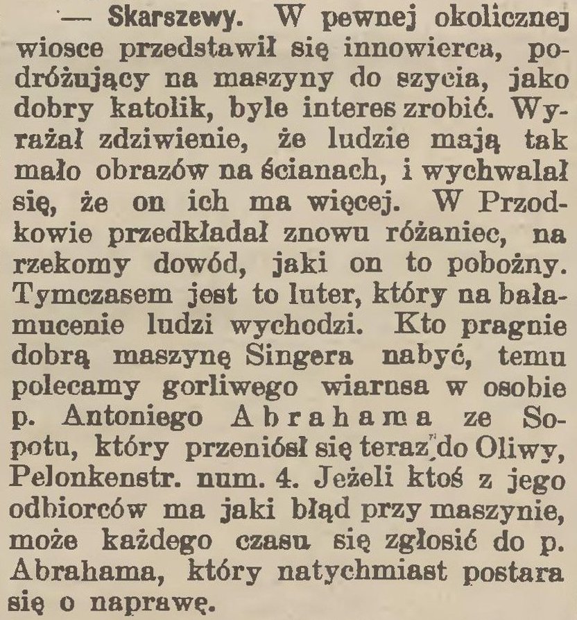"Doszczętnie zrujnowany powrócił Abraham do pracy najemnej. Zatrudnienie znalazł w filii znanej firmy maszyn do szycia i rowerów Singera i Neidlingera w Gdańsku. 2 października 1909 roku przeniósł się z rodziną do Oliwy i zamieszkał najpierw przy Pelonkerstrasse 4 (ul. Polanki), potem w pensjonacie Marty Krzyżewskiej przy Ludolfinerstrasse 2 (obecna ul. Józefa Czyżewskiego), który to dom został rozebrany w 1978 roku.