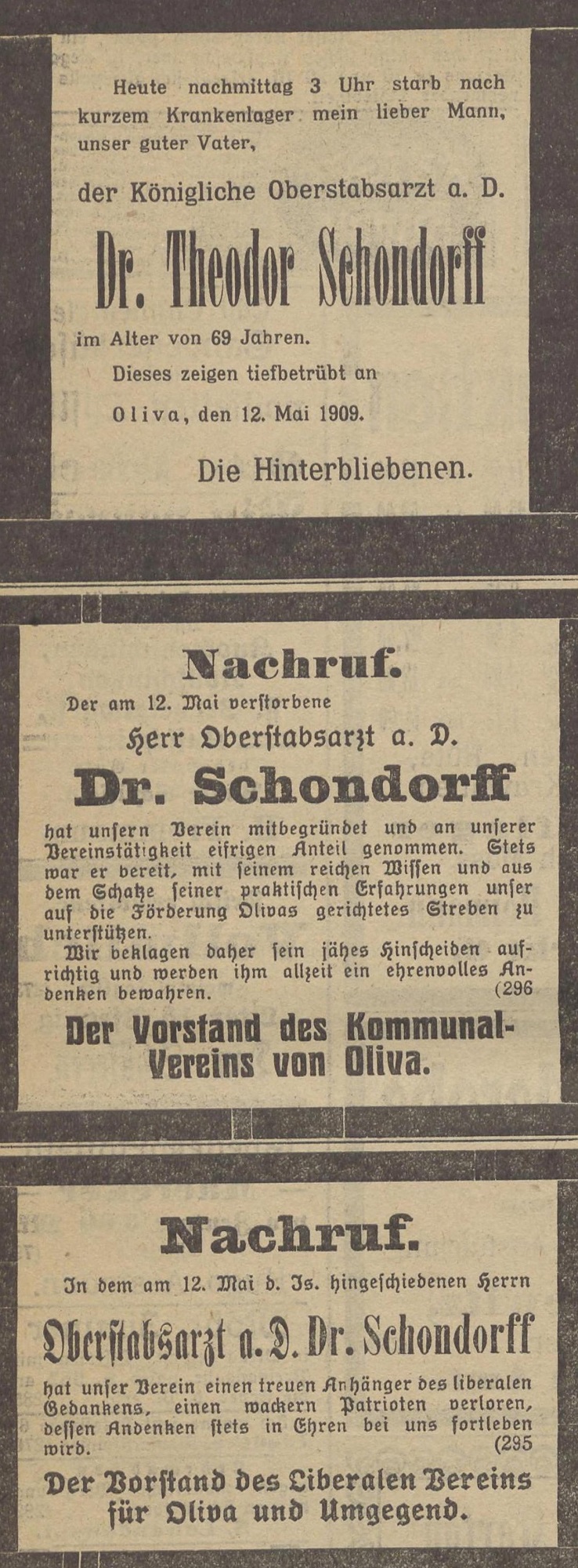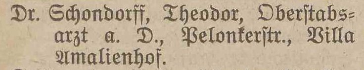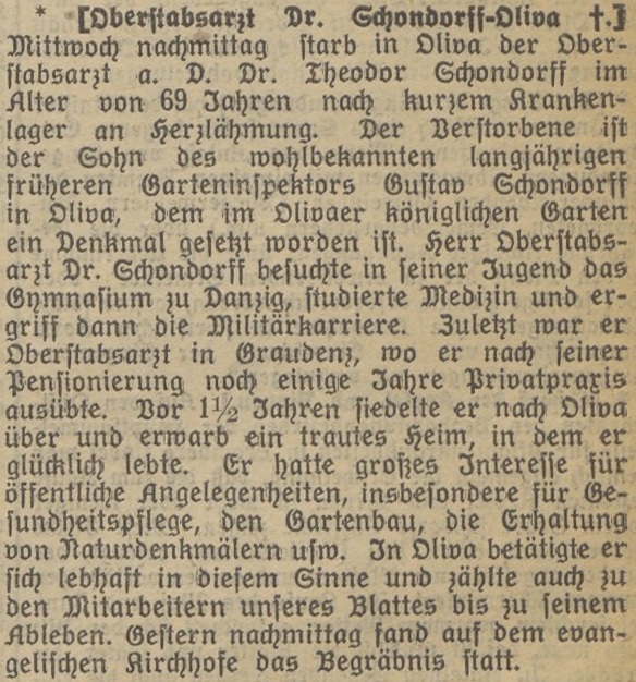 W środę [] po południu w Oliwie zmarł starszy lekarz sztabowy Theodor Schondorff w wieku 69 lat po krótkiej chorobie z powodu porażenia serca.
