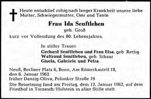 Heute entsdJ.Iief ruhig nach langer Krankheit unsere liebe MuHer, Schwiegermutter, Omi und Tante Frau Ida Senftleben geb. Groß kurz vor Vollendung des 80. Lebensjahres. In stiller Trauer Gerhard Senftleben und Frau Eisa, geb Rettig Waltraud Senmeben, geb. Schaar Gisela, Gabriele und Petra Neuß, Berliner Platz 6, Bonn, Am Römerkastell 18, den 6. Januar 1962 früher Danzig-Oliva, Pelonker Straße 19 Die Beiset.zung fand am Freitag, dem 12, Januar 1962, auf dem Friedhof in TornesdJ./Holstein in aller Stille statt.Ida Senftleben (ur. 1882 - zm. 1962). Oliwa ul. Polanki nr 19. Internet: www.danzig.de - Sterbeanzeigen.