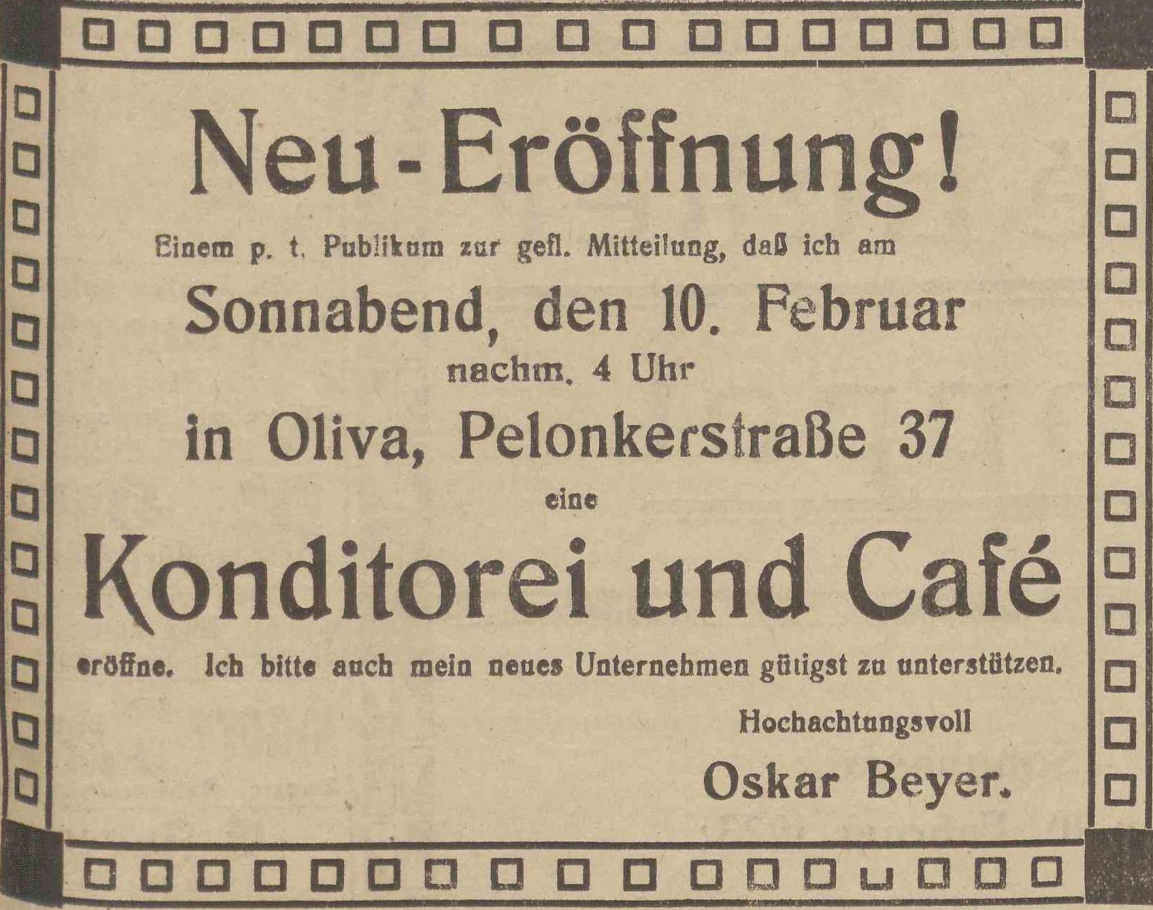 Café Oskar Beyer. Olivaer Zeintung nr 34 z 09. 02. 1923 r.