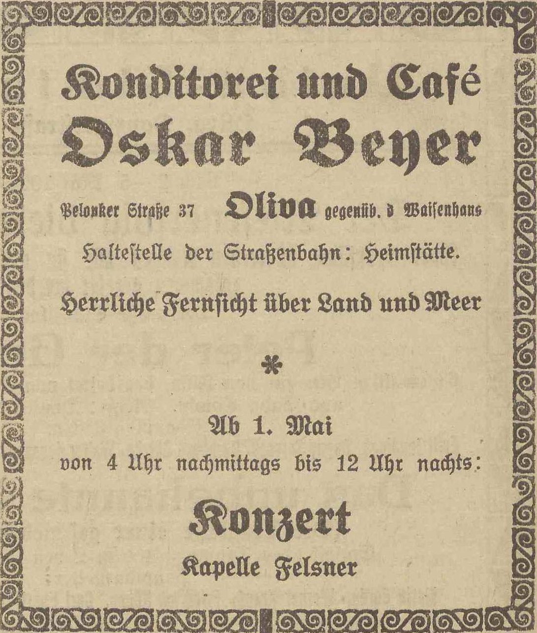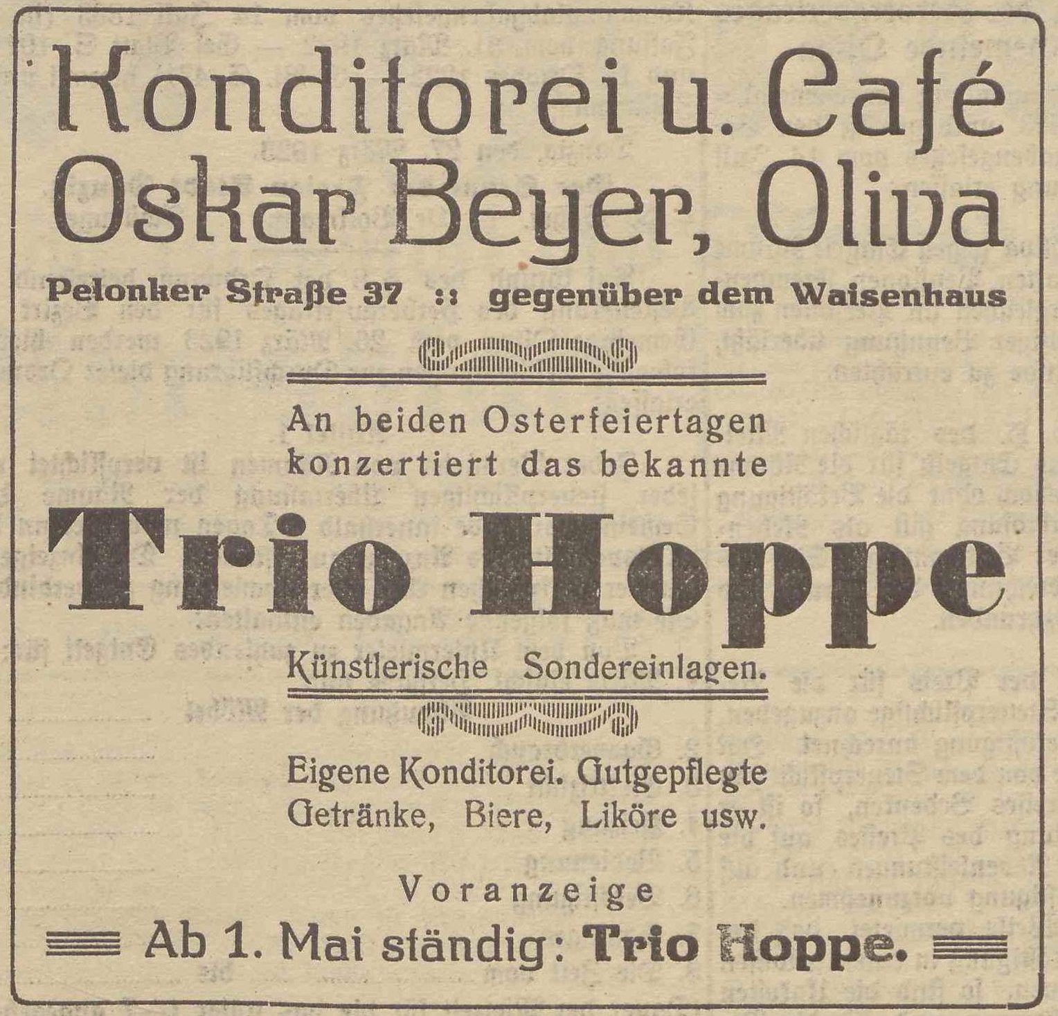 Café Oskar Beyer. Olivaer Zeintung nr 102 z 02. 05. 1924 r.