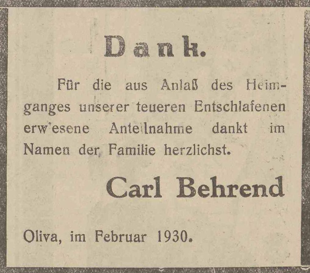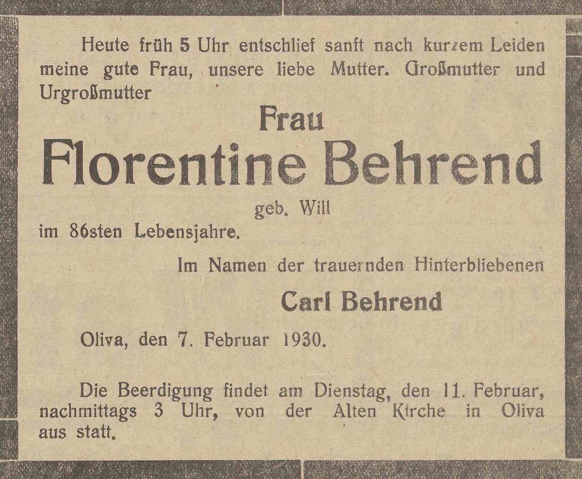 Florentine Behrend zd. Will. Carl Behrend. Olivaer Zeintung nr 33 z 08. 02. 1930 r.