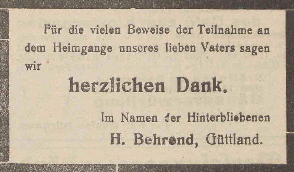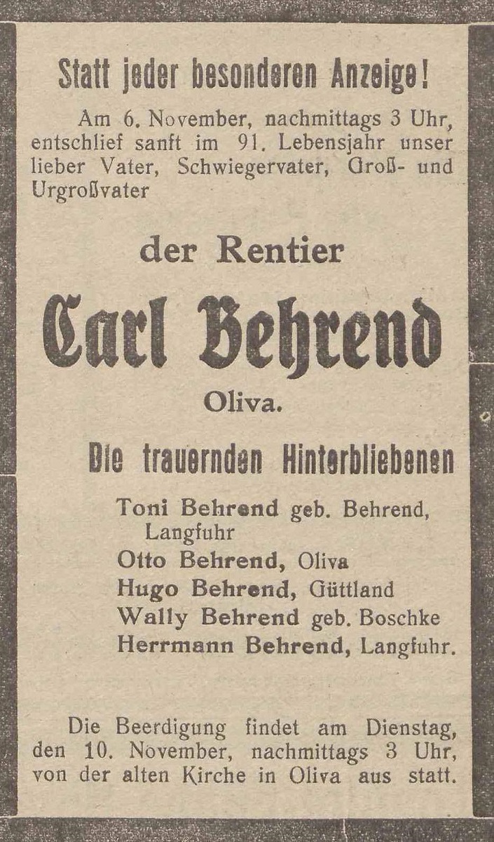 Carl Behrend. Hermann Behrend, Toni Behrend zd. Behrend (Langfuhr). Otto Behrend (Pelonken 6. Hof). Hugo Behrend. Wally Behrend zd. Boschke. Danzig-Olivaer Zeintung nr 262 z 07. 11. 1931 r.