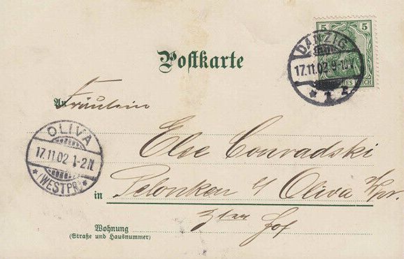 Else Conradski. Pocztówka wysłana z Gdańska do Oliwy 17. 11. 1902 roku. Ze strony www.eBay.de.