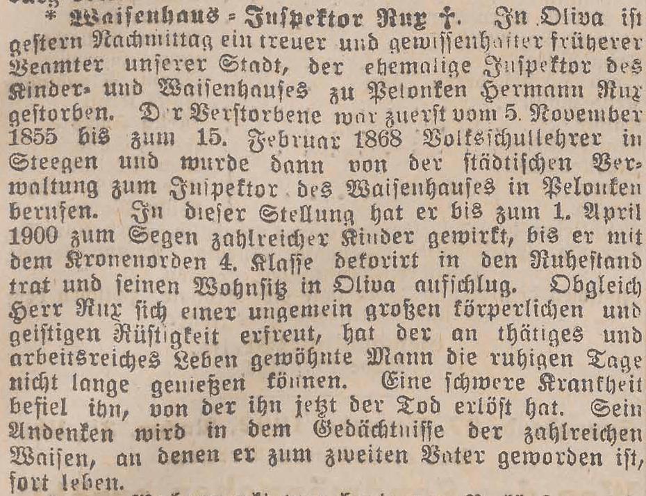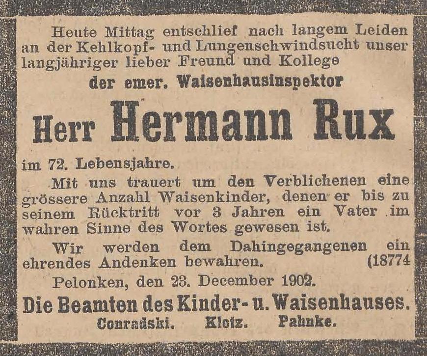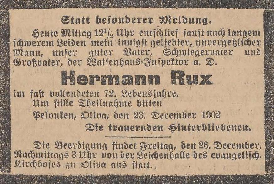 Hermann Rux. Danziger Neueste Nachrichten nr 301 z 24. 12. 1902. Przekazała Grażyna Niemyjska.