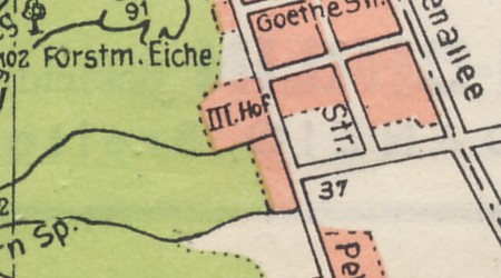 Dwór 3. Fragment kolorowego planu Gdańska wydanego przez Miejski Urzęd Pomiarów (Städtischen Vermessungsamt) w 1933 roku. Z kolekcji Biblioteki Uniwersytetu Chicago.