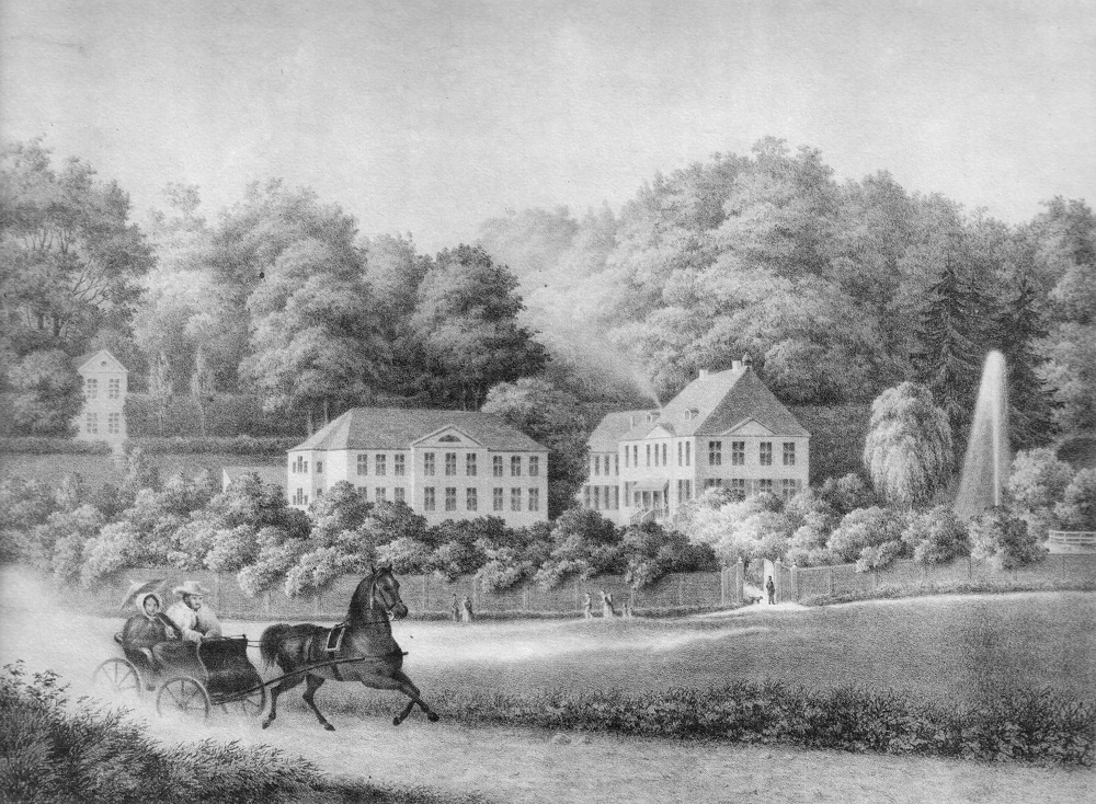 Replika litografii zatytułowanej "Wasser Heil Anstalt Pelonken neben Oliva bei Danzig. Lithoger. Anstalt v. Julius Saueri. Danzig." Około 1875-1885 roku. Zbiory Piotra Leżyńskiego.