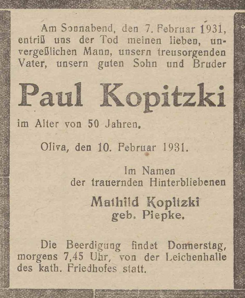 Paul Kopitzki. Mathild Kopitzki zd. Piepke. Danzig-Olivaer Zeintung nr 34 z 10. 02. 1931 r.