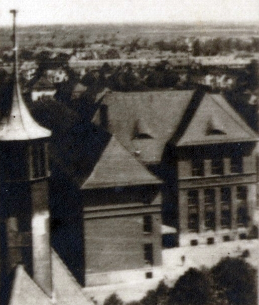 Budynek liceum. Około 1918 roku. W tle budowa kościoła przy ul. Leśnej. Zbiory Piotra Leżyńskiego.