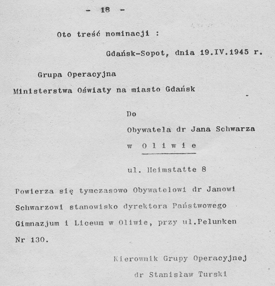 19 kwietnia Kierownik Grupy Operacyjnej, dr Stanisław Turski, powierzył mi stanowisko dyrektora Państwowego Gimnazjum i Liceum w Oliwie.