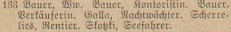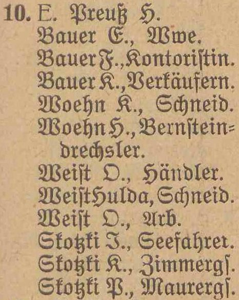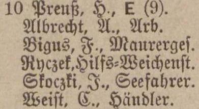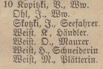 Busch, Amalie, geb. Koenig, Wirthin. Kopitzki, Veronika, geb. Weichbrodt. Krutikowski, Amalie, geb. Schlicht. Skokki, Johann, Seefahrer. Stephan, Aug. gb. Lewrenz, Ww. Wach, Hermann, pens. Orenzaufs. Weist, Karl, Händler.