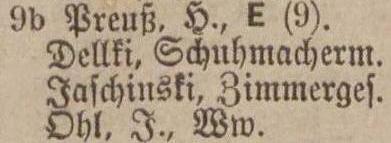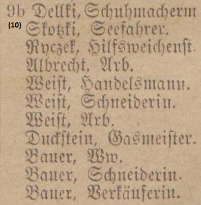 Krußikowski, Amalie, geb. Schlicht. Busch, Amalie, geb. Koenig Wirthin. Kopitzki, Veronica, geb. Weichbrodt. Pecka, Franz, Alb., Militairanwärt. Skotzki, Johann, Seefahrer. Stephan, Aug., geb. Lewrenz, Ww. Wach, Hermann, pens. Grenzaufseher. Weist, Carl, Händler.