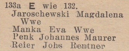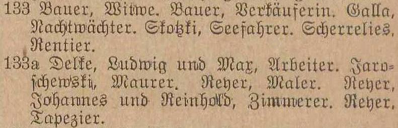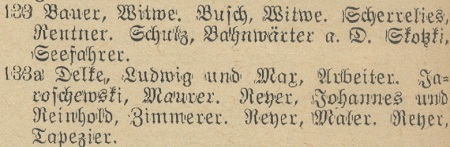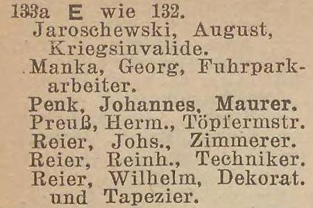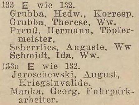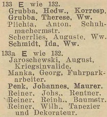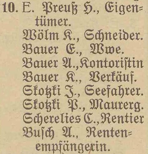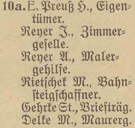 Preuß, Heinrich, właściciel †. Kapitki, Veronika, z domu Weichbrot, wdowa. Ohl, Johann, invalida. Rischek, Leo, zwrotniczy. Schibjerowski, Hermann, czeladnik ciesielski. Skotzki, Johann, marynarz. Wach, Hermann, emerytowany pracownik straży granicznej. Weitz, Karl, handlarz.