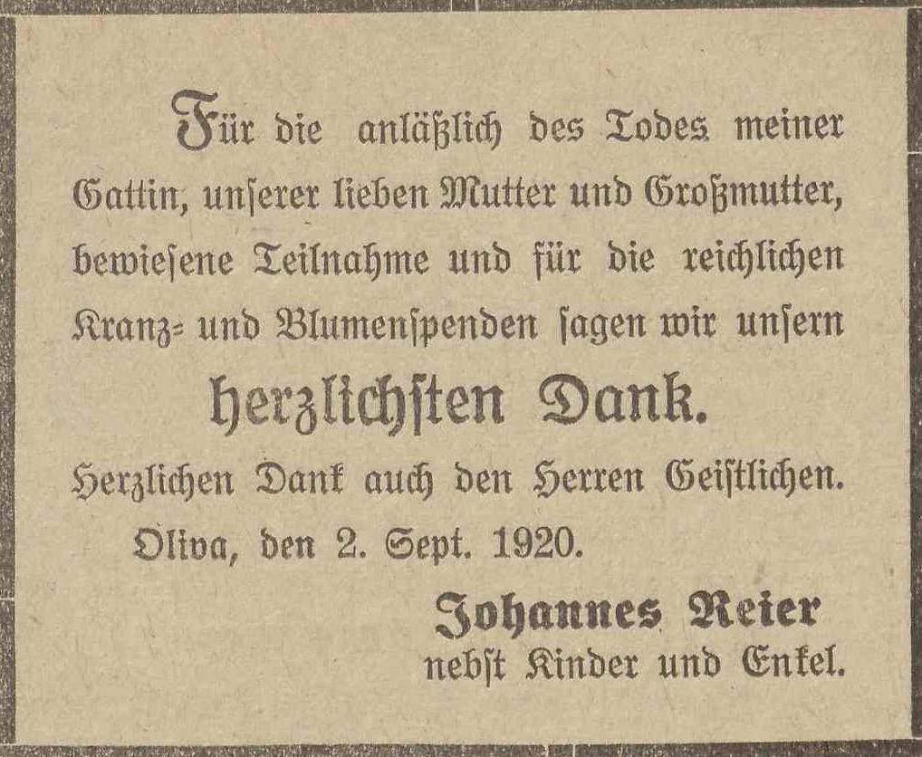 .Johannes Reier (Pelonkerstraße 133a). Olivaer Zeintung nr 206 z 3. 9. 1920 r.