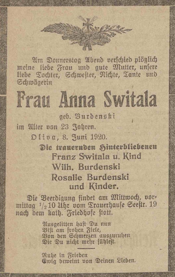 Anna Switala z domu Buderski. Olivaer Zeintung nr 131 z 08. 08. 1920 r.