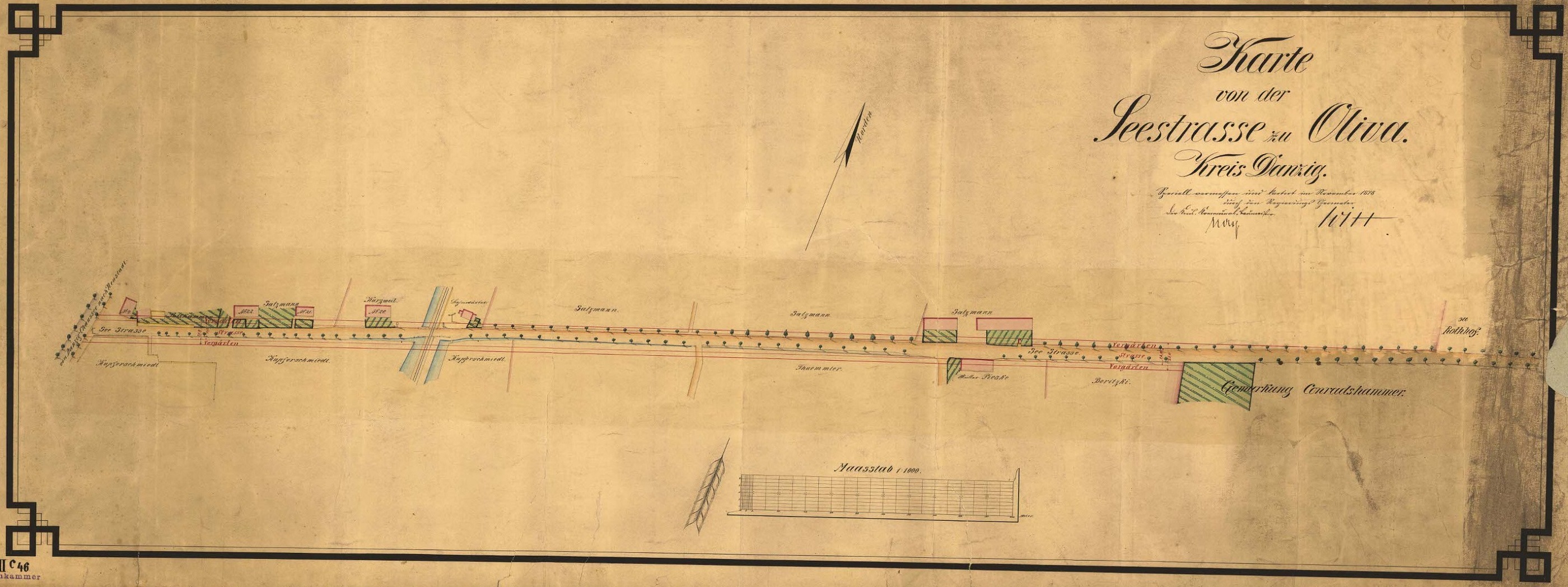 Fragment kolorowego planu Gdańska (Oliva, Seestraße) z 1933 roku. Z kolekcji Biblioteki Uniwersytetu Chicago.