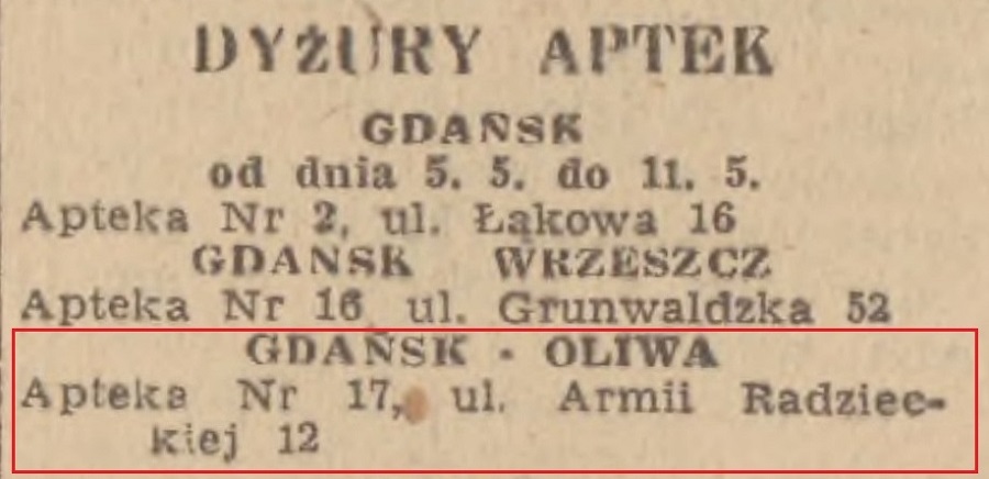 Apteka Pod "Orłem". Ul. Armii Radzieckiej. M. Granke i M. Kuźniak, Informator miasta Gdańska, Gdynia 1946. Zbiory Piotra Leżyńskiego.