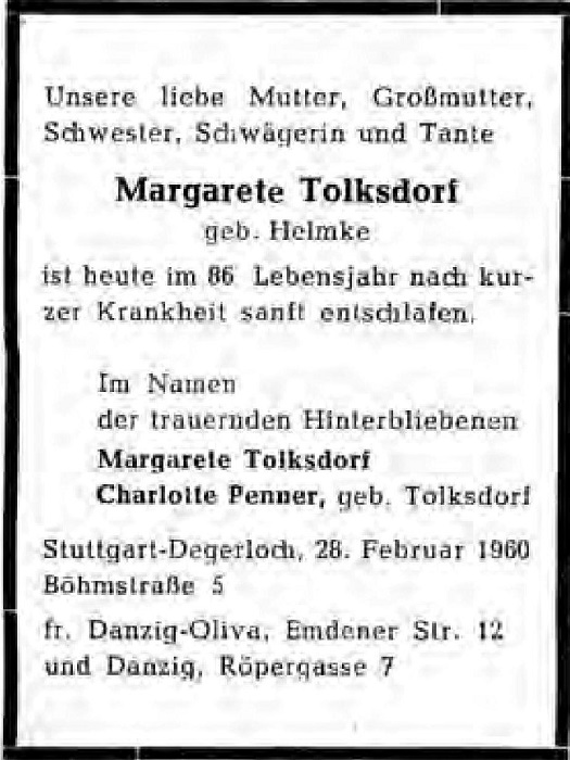 Margarete Tolksdorf z domu Helmke zmar³a w 1960 roku. Ze strony Genderi.org.