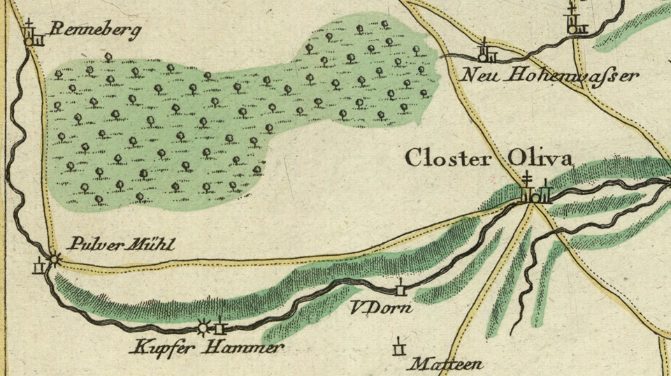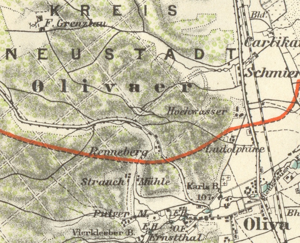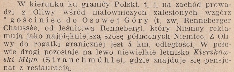 W kierunku ku granicy Polski, t. j. na zachód prowadzi z Oliwy wśród malowniczych zalesionych wzgórz gościniec do Osowej Góry (t. zw. Renneberger Chaussée, od leśnictwa Renneberg), który Niemcy reklamują jako najpiękniejszą szosę północnych Niemiec. Z Oliwy do rogatki granicznej jest 4 km, odległości. W połowie drogi pozostaje na lewo niewielkie letnisko Kierzkowski Młyn (Strauchmühle), gdzie znajduje się pensjonat z restauracją.