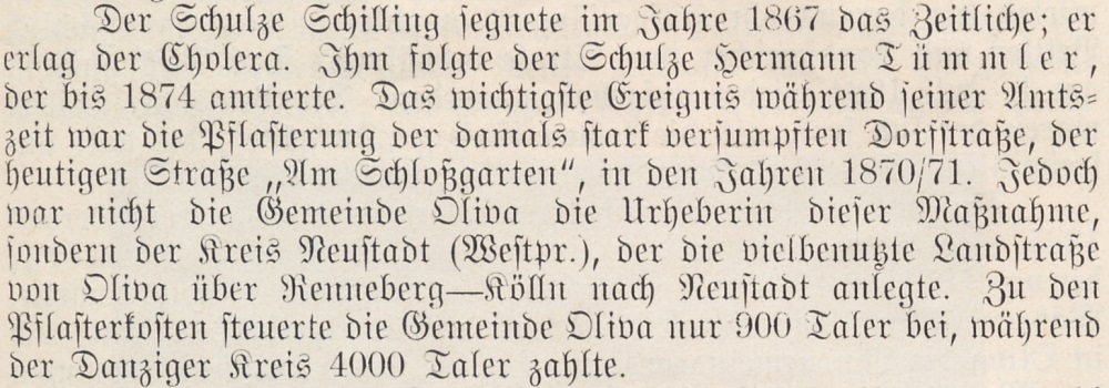 Der Schulze Schilling segnete im Jahre 1867 das Zeitliche; er erlag der Cholera. Jhm folgte der Schulze Hermann Tümmler, der bis 1874 amtierte. Das wichtigste Ereignis während seiner Amtszeit war die Pflasterung der damals stark verfumpsten Dorfstraße, der heutigen Straße "Am Schloßgarten“, in den Jahren 1870/71. Jedoch war nicht die Gemeinde Oliva die Urheberin dieser Maßnahme, sondern der Kreis Neustadt (Westpr.), der die vielbenutzte Landstraße von Oliva über Renneberg-Kölln nach Neustadt anlegte. Zu den Pflasterkosten steuerte die Gemeinde Oliva nur 900 Taler bei, während der Danziger Kreis 4000 Taler zahlte.