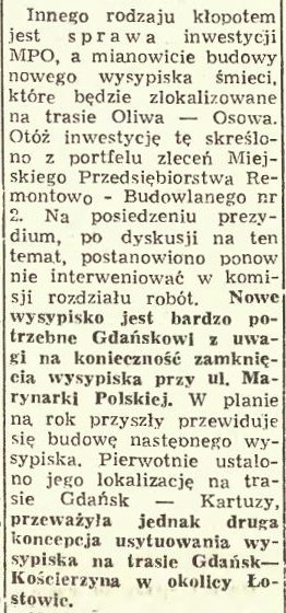 Innego rodzaju kłopotem jest sprawa inwestycji MPO, a mianowicie budowy nowego wysypiska śmieci, które będzie zlokalizowane na trasie Oliwa-Osowa. Otóż inwestycję tę skreślono z portfelu zleceń Miejskiego Przedsiębiorstwa Remontowo - Budowlanego nr 2. Na posiedzeniu prezydium po dyskusji na ten temat, postanowiono ponownie interweniować na komisji rozdziału robót. Nowe wysypisko jest bardzo potrzebne Gdańskowi z uwagi na konieczność zamknięcia wysypiska przy ul. Marynarki Polskiej. W planie na rok przyszły przewiduje się budowę nowego wysypiska. Pierwotnie ustalono jego lokalizację na trasie Gdańsk - Kartuzy, przeważyła jednak druga koncepcja usytuowania wysypiska na trasie Gdańsk - Kościerzyna w okolicy Łostowic.