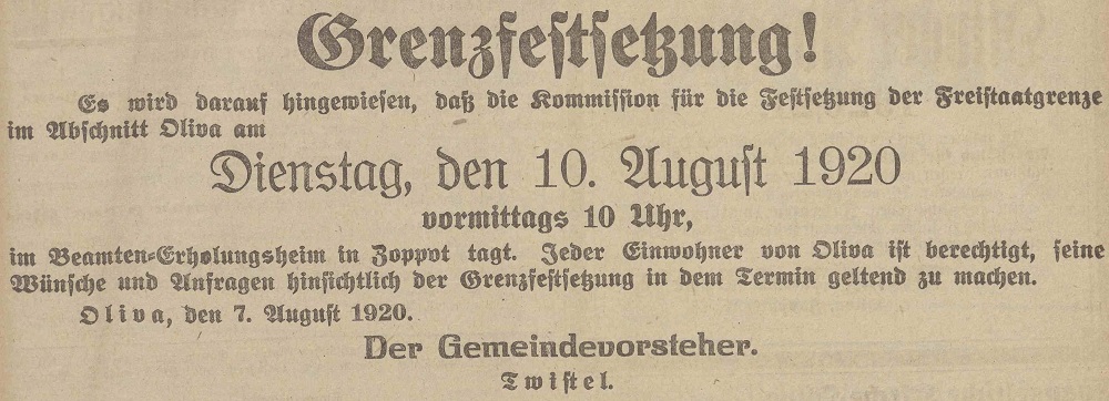 Ustalenie granicy! Olivaer Zeintung nr 184 z 09. 08. 1920 r.