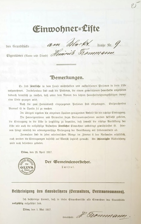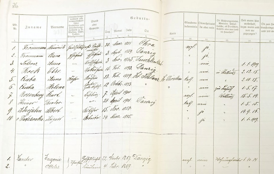 Spis z 1917 roku › Zbiory: Archiwum Państwowe w Gdańsku - sygnatura: APG 760/594 Przekazała Grażyna Niemyjska (25) Am Markt 9. Właściciel: Heinrich Frommann. ![]() (26) Am Markt 9. Mieszkańcy: Frommann, Lohrenz, Kock?, Czuba?, Rosenberg?. Heiner?, ..., ..., Zander. ![]()