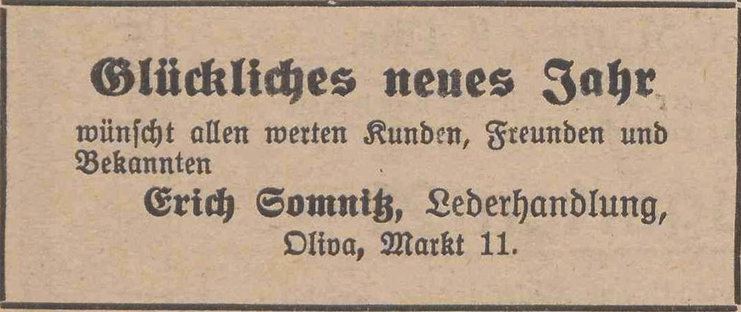Erich Somnitz, Lederhandlung. Podziękowania noworoczne, Olivaer Zeitung nr 305 z 31. 12. 1929.