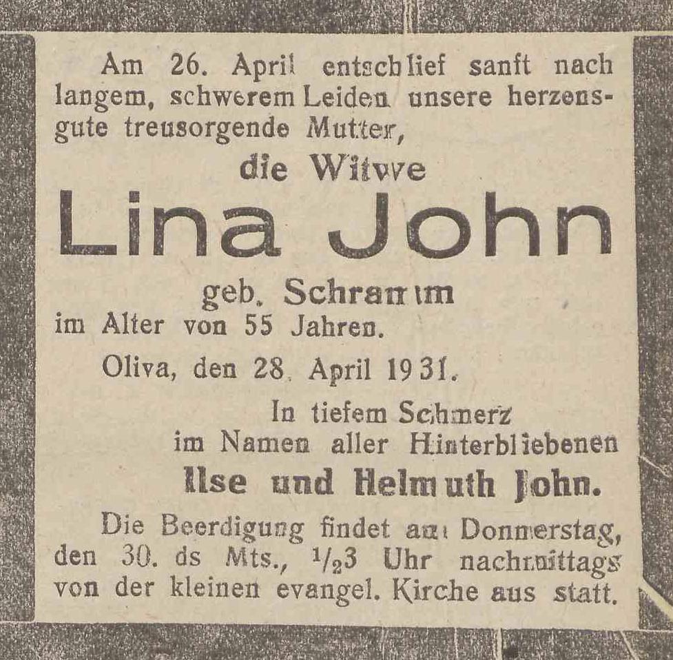 Lina John zd. Schrannm. Ilse John. Helmuth John. Danzig-Olivaer Zeintung nr 98 z 28. 04. 1931 r.