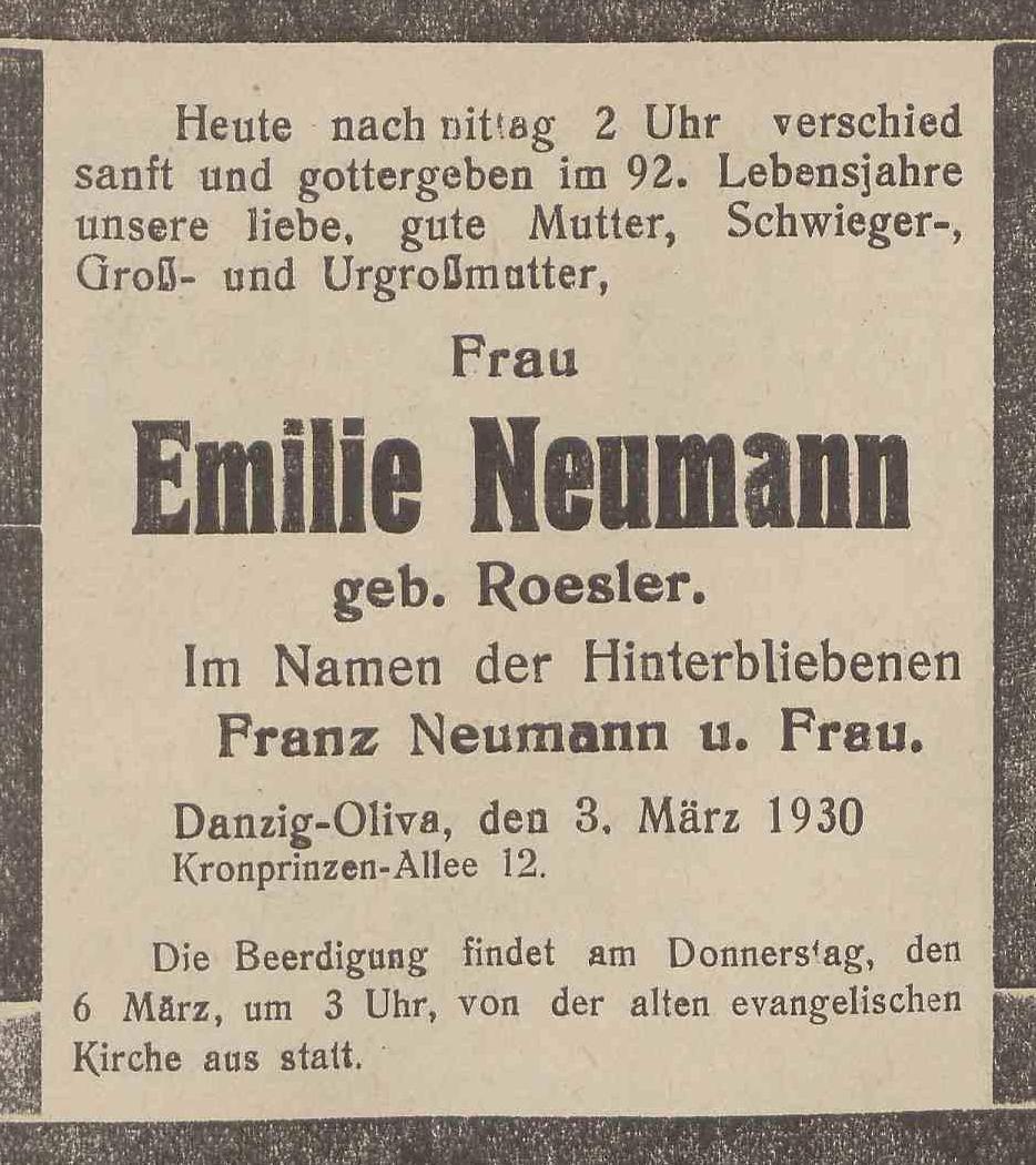 Emilie Neumann zd. Roesler. Franz Neumann. Olivaer Zeintung nr 53 z 04. 03. 1930 r.