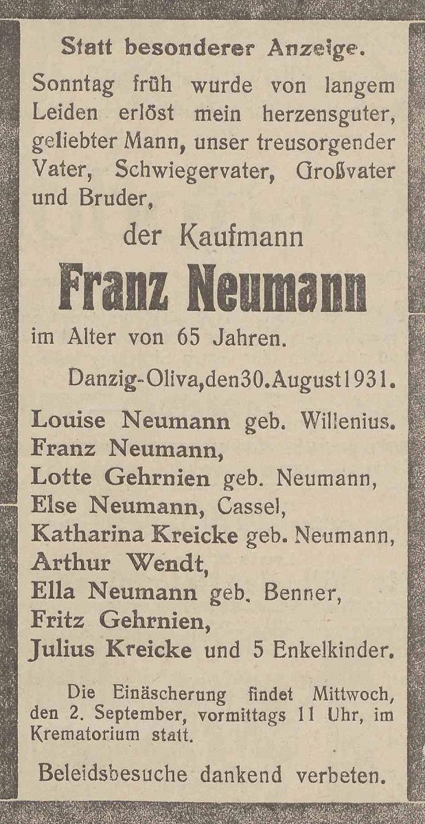 Franz Neumann. Louise Neumann zd. Willenius. Franz Neumann. Fritz, Lotte Gehrnien zd. Neumann. Else Neumann. Julius, Katharina Kreicke zd. Neumann. Ella Neumann zd. Benner. Danzig-Olivaer Zeintung nr 203 z 31. 08. 1931 r.