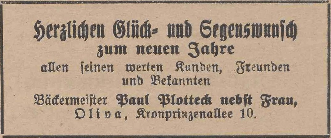 Paul Plottek, Bäckermeister. Podziękowania noworoczne, Olivaer Zeitung nr 305 z 31. 12. 1929.