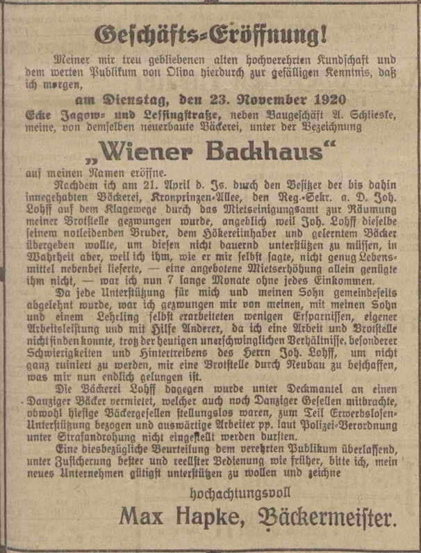 Max Hapke. Piekarnia Wiedeńska. Olivaer Zeintung z 07. 1920. Przekazała Grażyna Niemyjska.