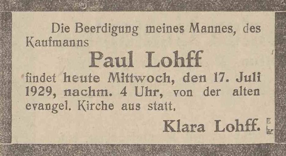 Paul Lohff. Klara Lohff. Olivaer Zeintung nr 165 z 17. 07. 1929 r.