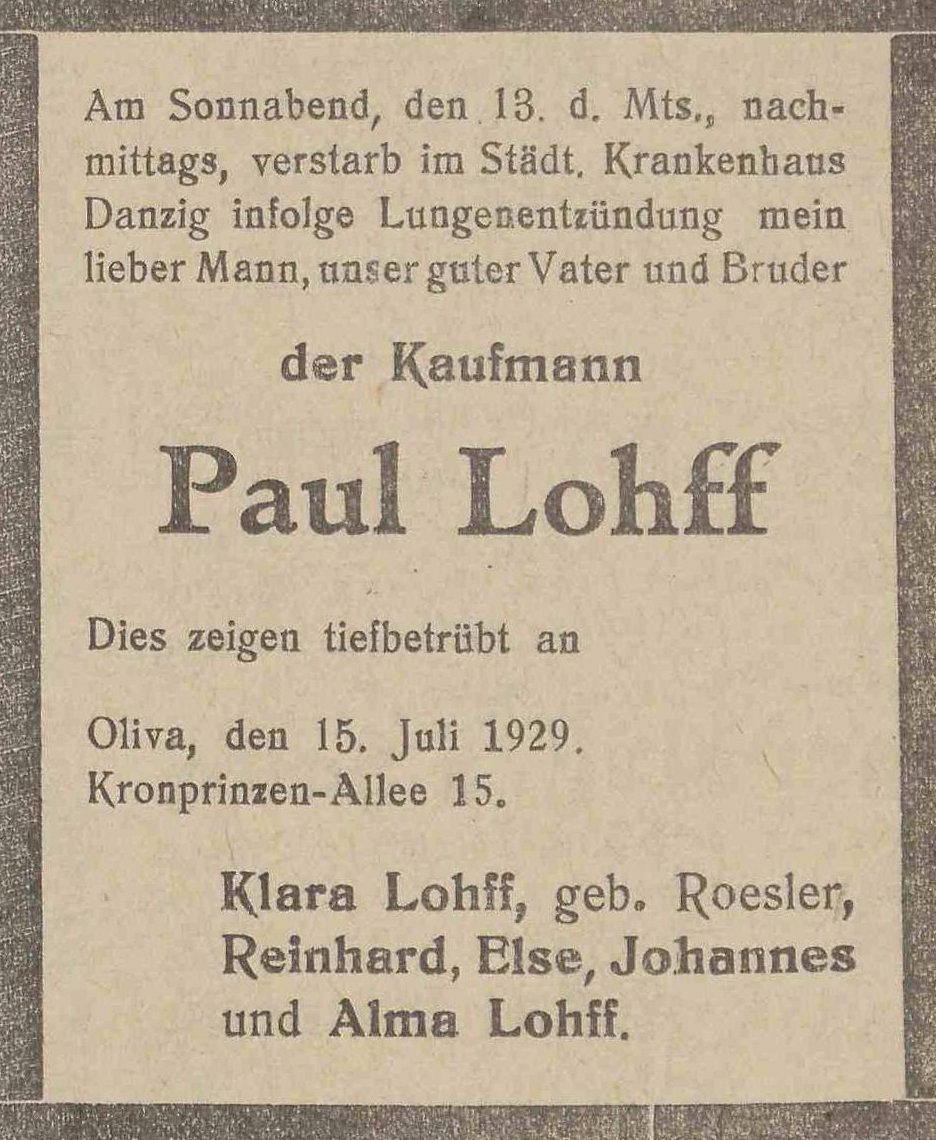 Paul Lohff. Klara Lohff zd. Roesler. Reinhard, Else, Johannes, Alma Lohff. Olivaer Zeintung nr 164 z 16. 07. 1929 r.